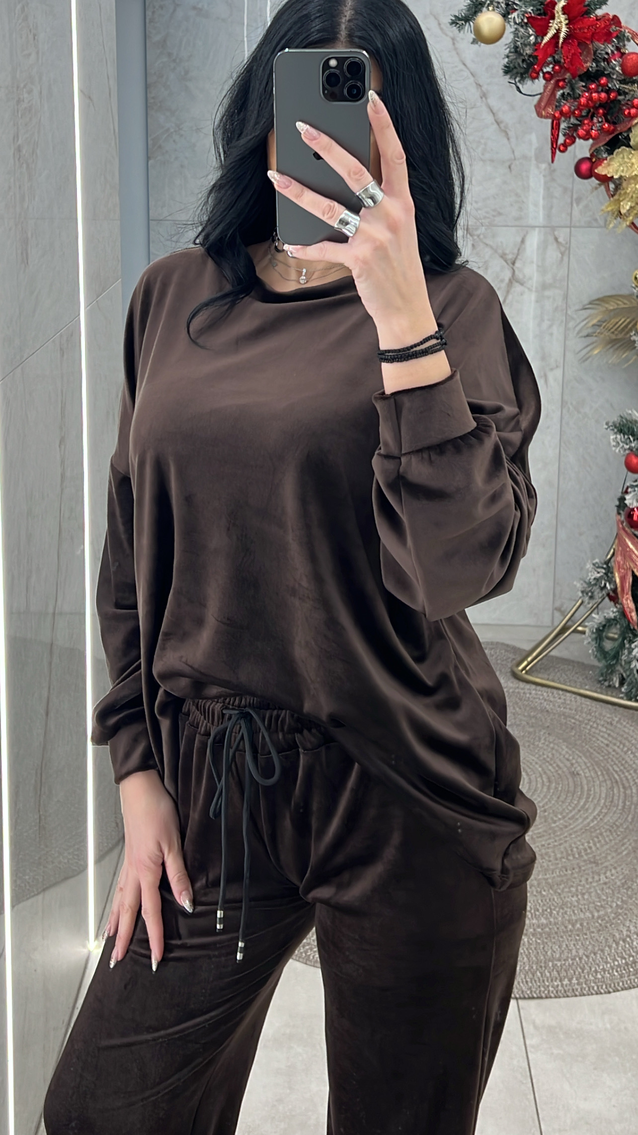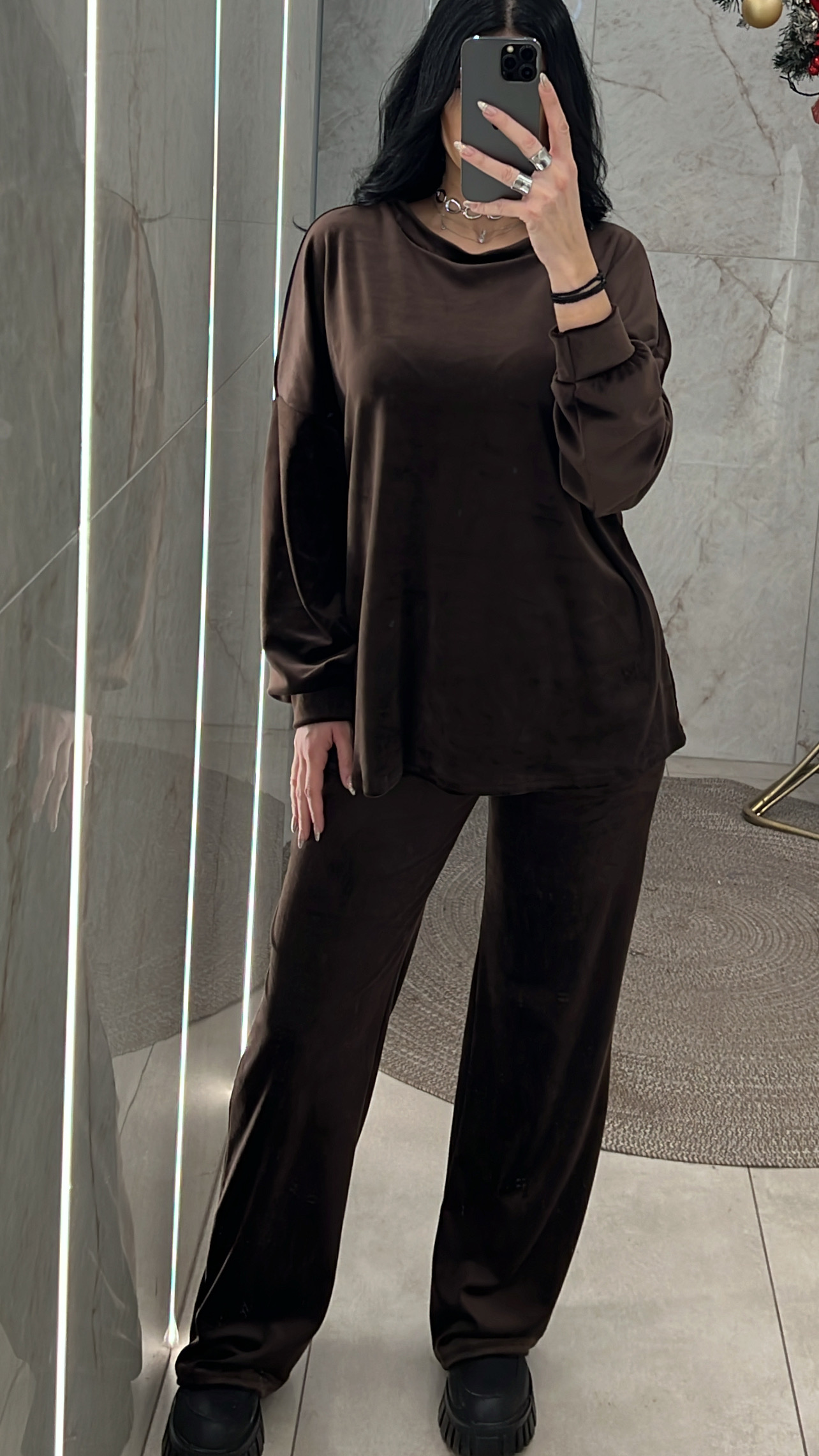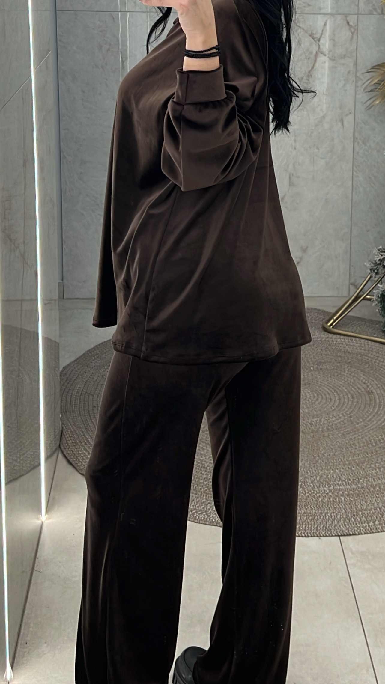 Σετ βελουτέ. Η μπλούζα είναι με λαιμόκοψη και το παντελόνι είναι με λάστιχο και κορδόνι στην μέση