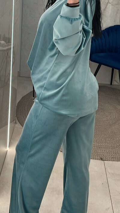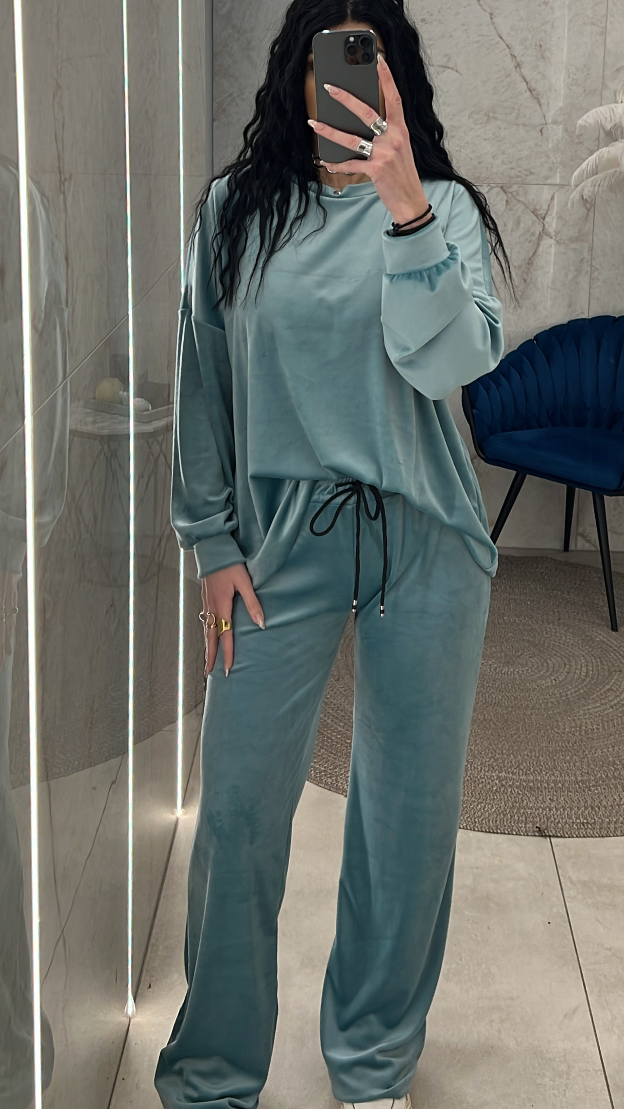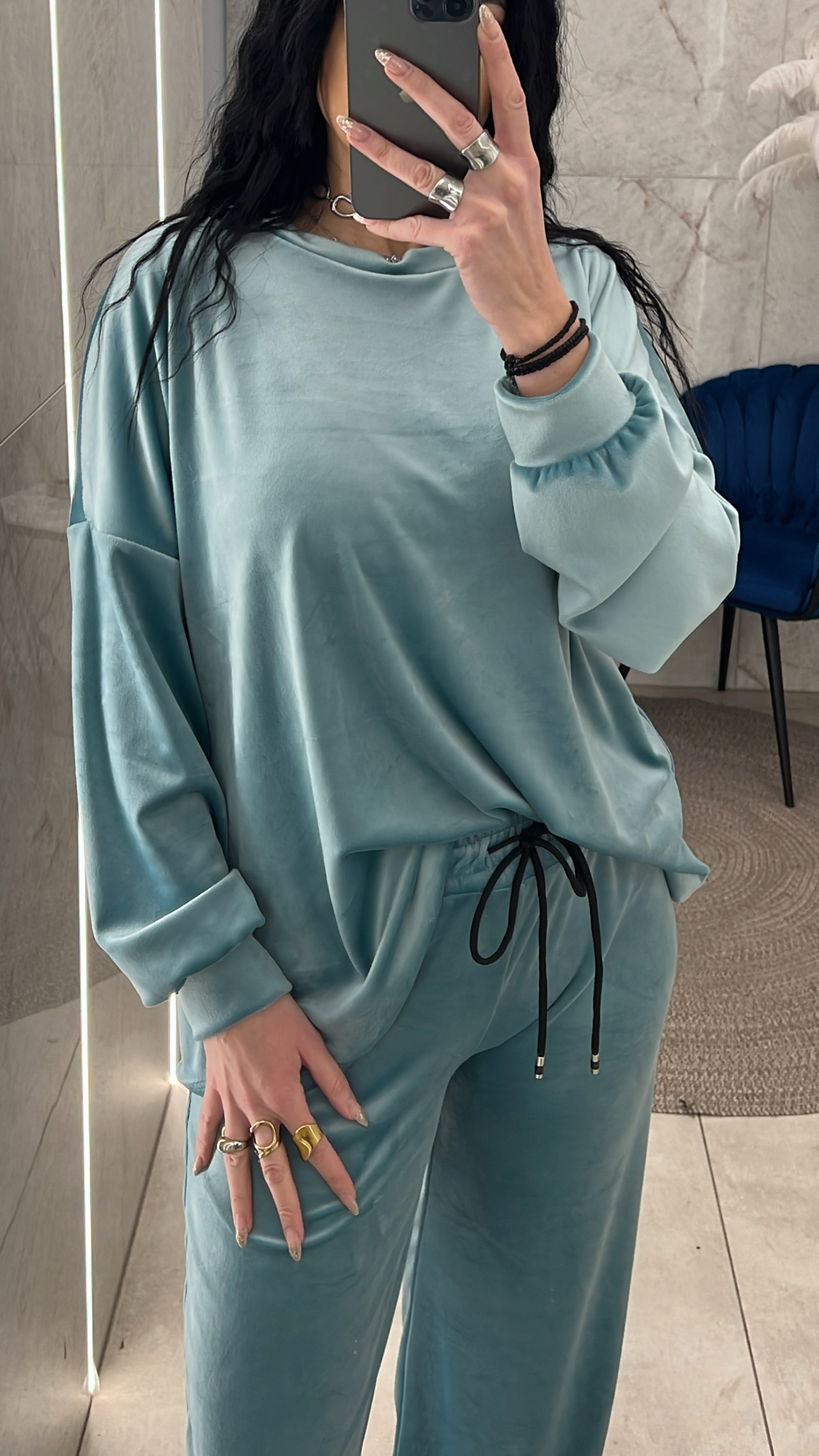 Σετ βελουτέ. Η μπλούζα είναι με λαιμόκοψη και το παντελόνι είναι με λάστιχο και κορδόνι στην μέση