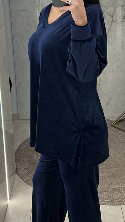 Σετ βελουτέ oversized. Η μπλούζα είναι με v και ανοίγματα στο τελείωμα και το παντελόνι έχει λάστιχο στην μέση