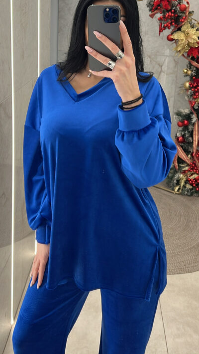 Σετ βελουτέ oversized. Η μπλούζα είναι με v και ανοίγματα στο τελείωμα και το παντελόνι έχει λάστιχο στην μέση