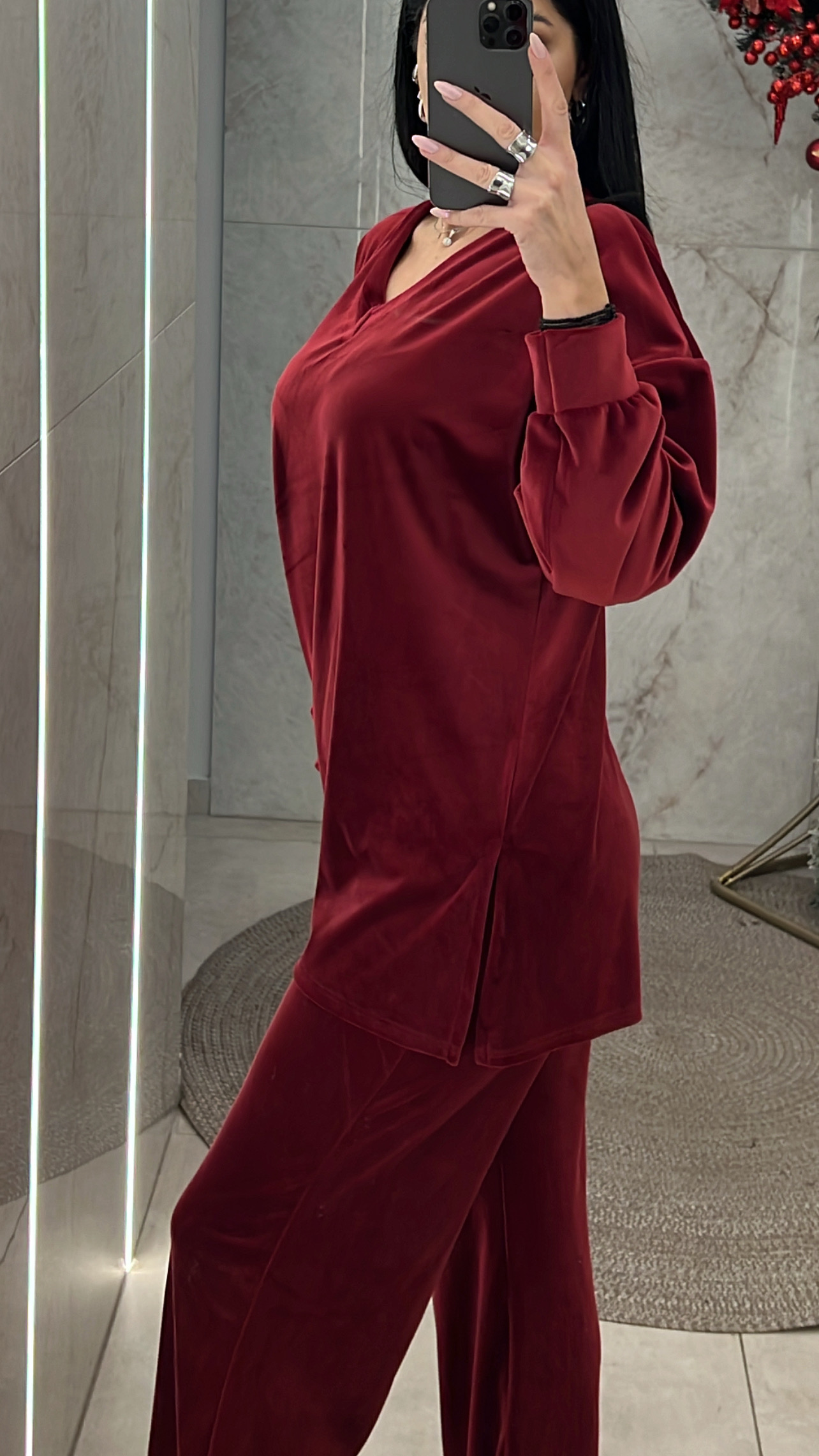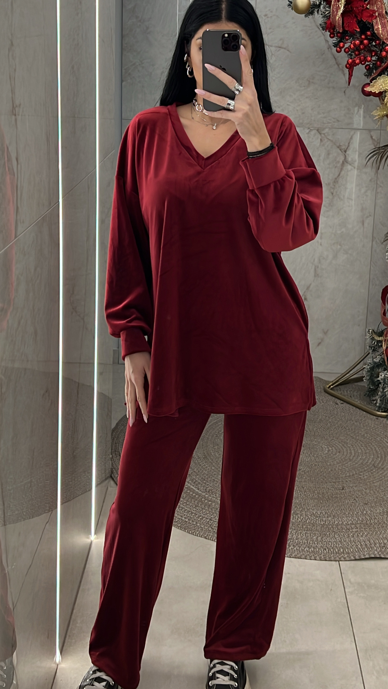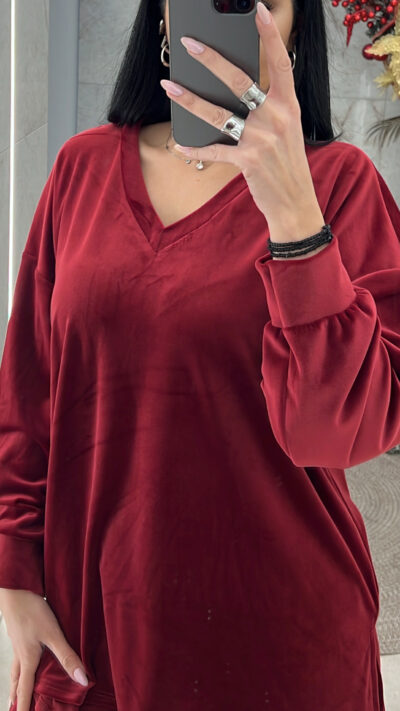 Σετ βελουτέ oversized. Η μπλούζα είναι με v και ανοίγματα στο τελείωμα και το παντελόνι έχει λάστιχο στην μέση