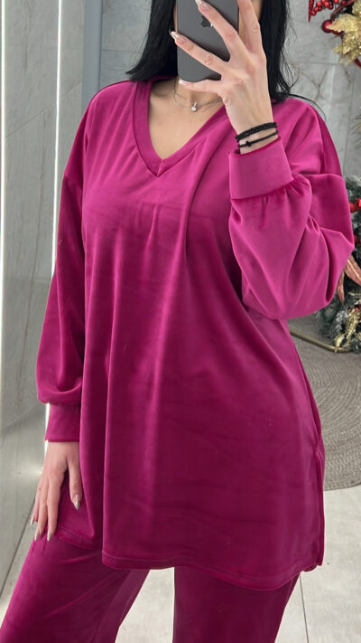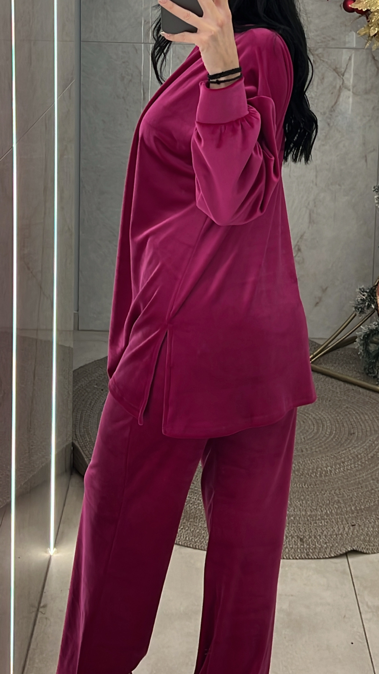 Σετ βελουτέ oversized. Η μπλούζα είναι με v και ανοίγματα στο τελείωμα και το παντελόνι έχει λάστιχο στην μέση