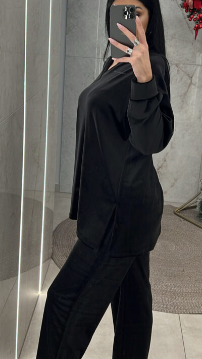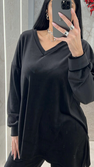 Σετ βελουτέ oversized. Η μπλούζα είναι με v και ανοίγματα στο τελείωμα και το παντελόνι έχει λάστιχο στην μέση