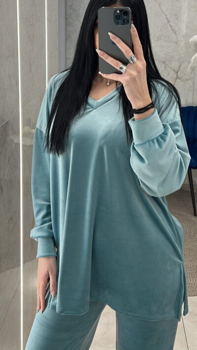 Σετ βελουτέ oversized. Η μπλούζα είναι με v και ανοίγματα στο τελείωμα και το παντελόνι έχει λάστιχο στην μέση