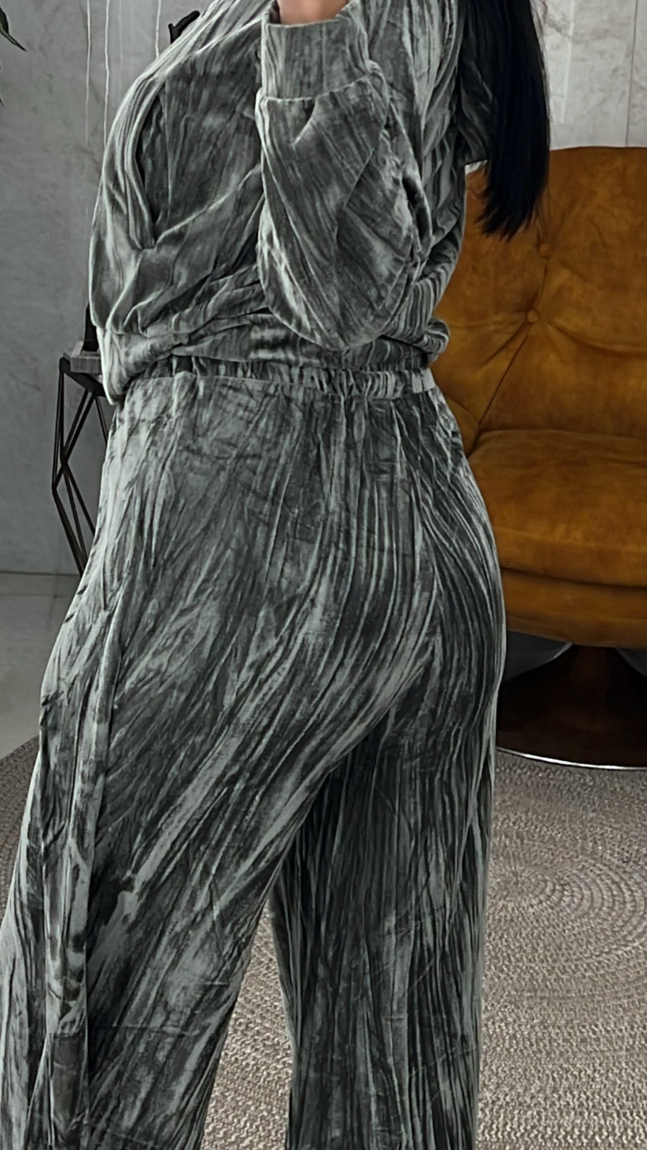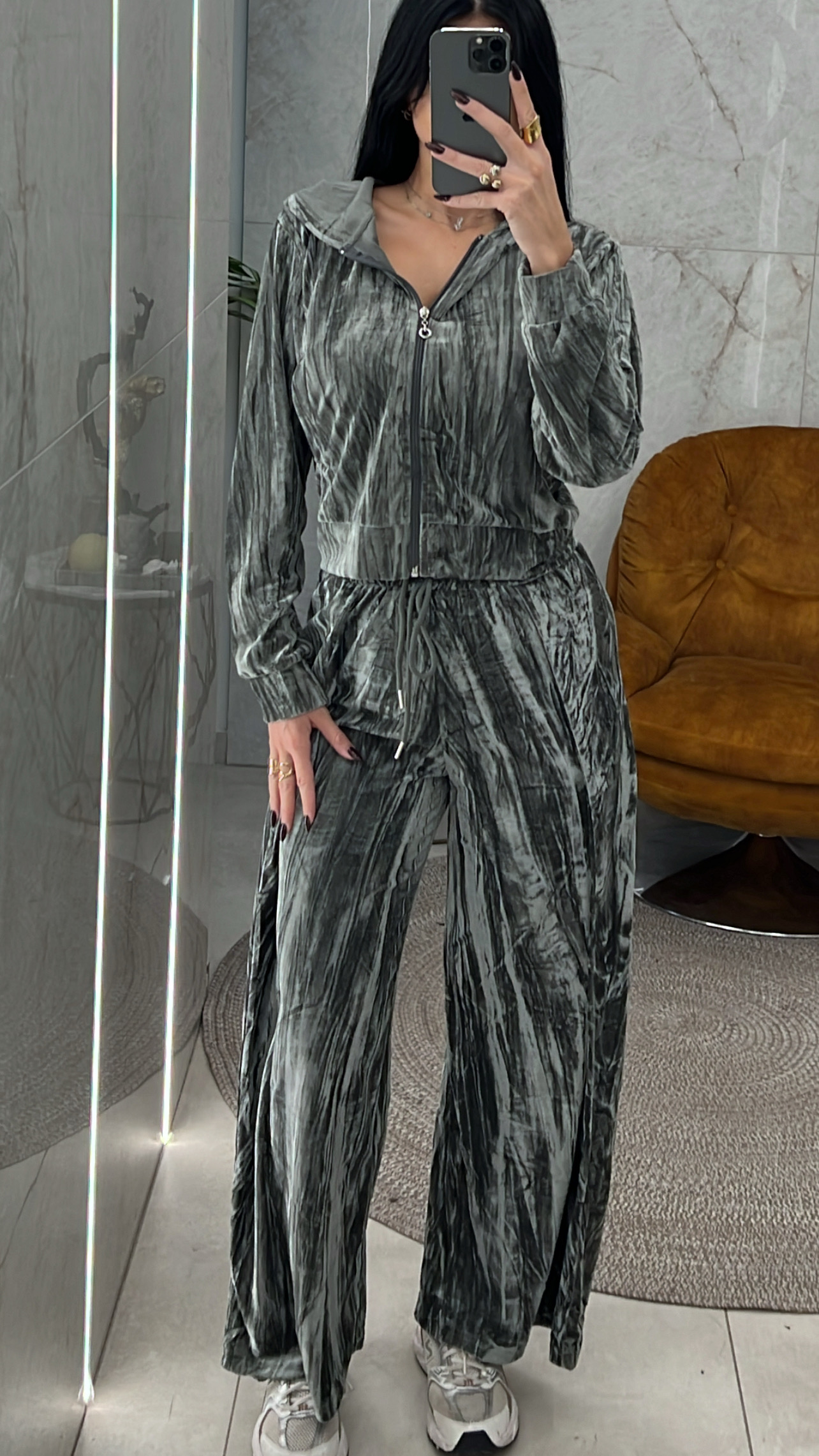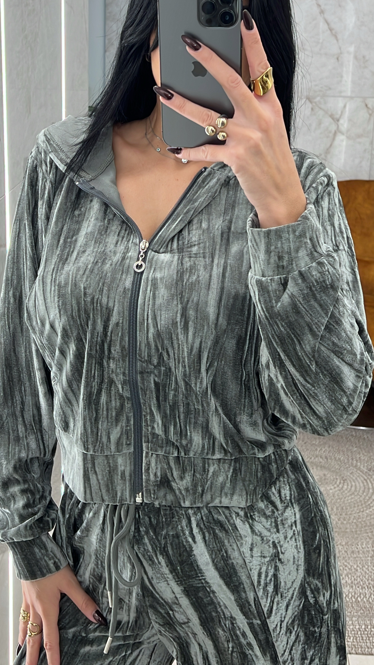 Σετ βελουτέ γκρι.Η ζακέτα έχει κουκούλα και το παντελόνι έχει κορδόνι και λάστιχο στην μέση
