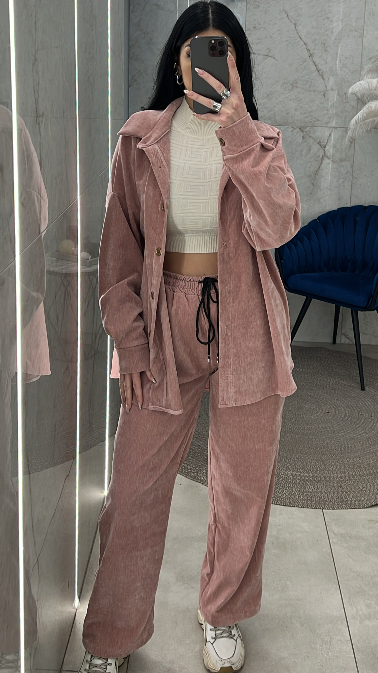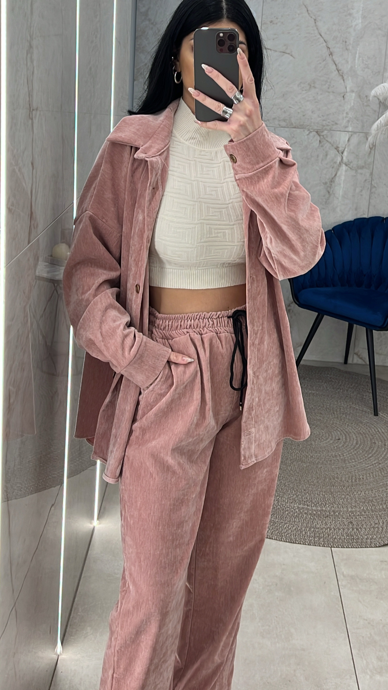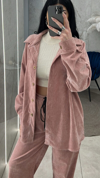 Σετ Βελουτέ με πουκάμισο που κλείνει με χρυσά κουμπιά και παντελόνι με λάστιχο στη μέση κορδόνι και τσέπες