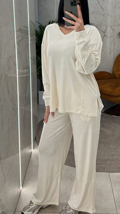 Η μπλούζα είναι με v και το παντελόνι έχει λάστιχο στην μέση