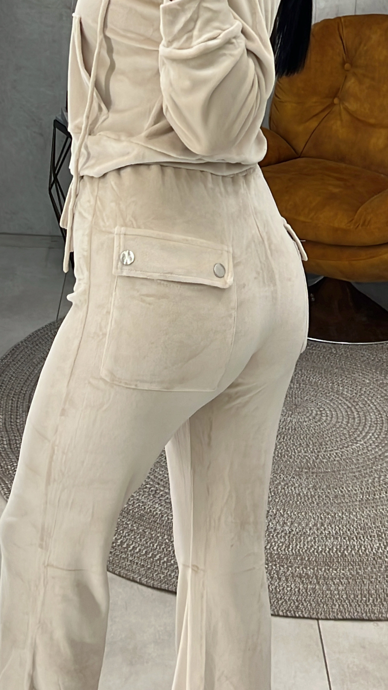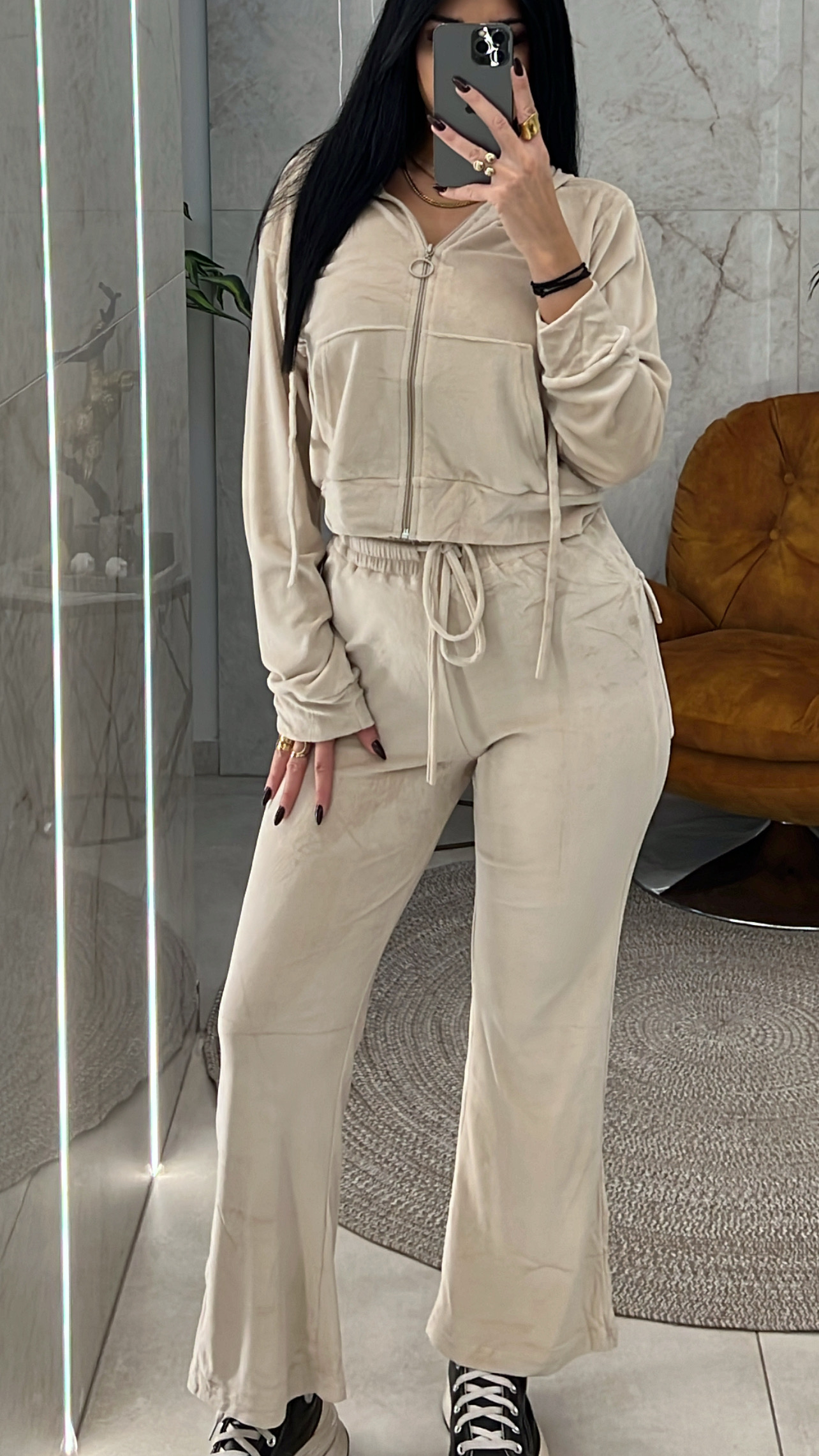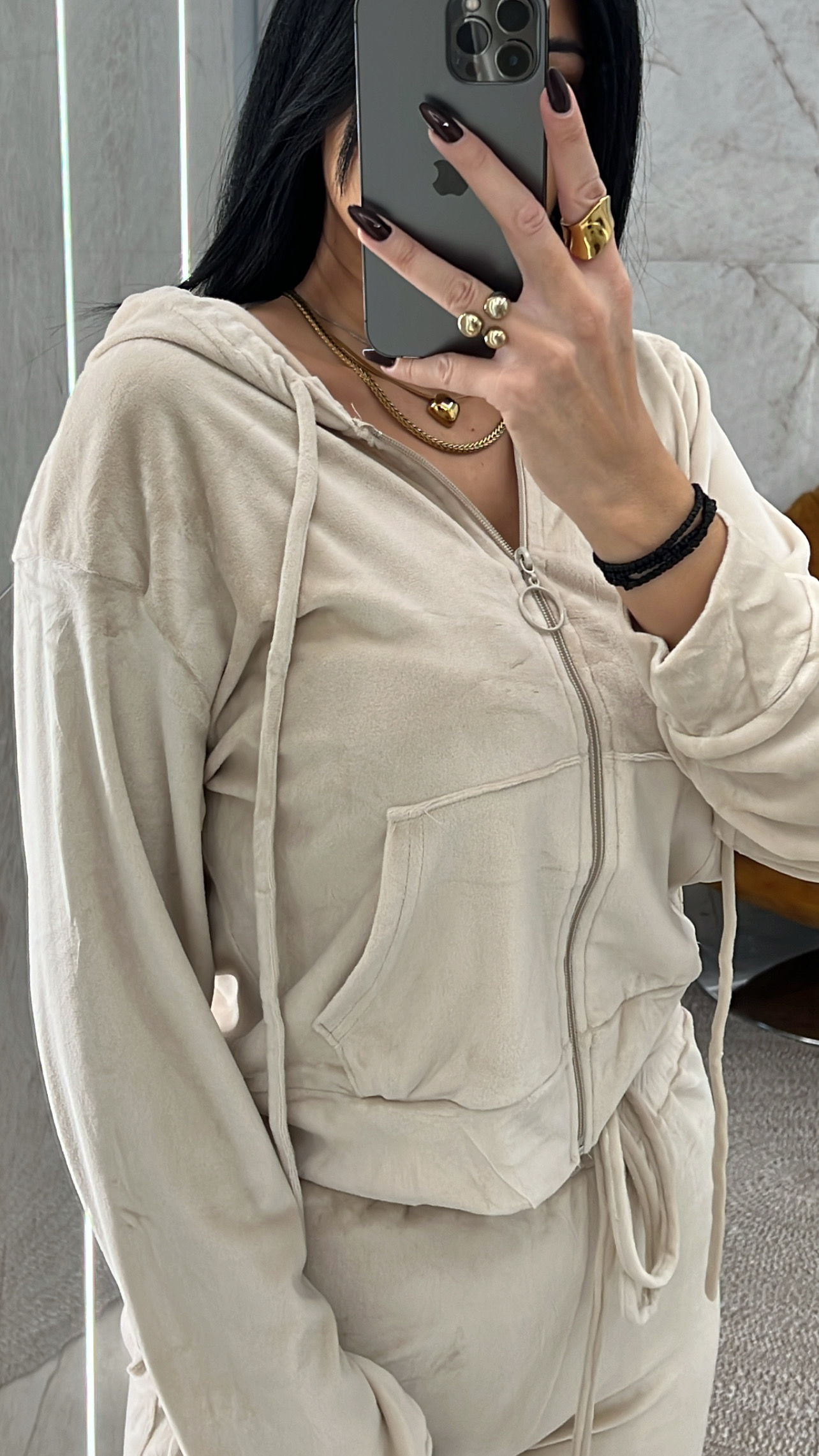 Η ζακέτα διαθέτει ι κουκούλα έχει τσέπες μπροστά και λάστιχο στα μανίκια το παντελόνι έχει λάστιχο και κορδόνι στην μέση και έχει τσέπες πίσω.