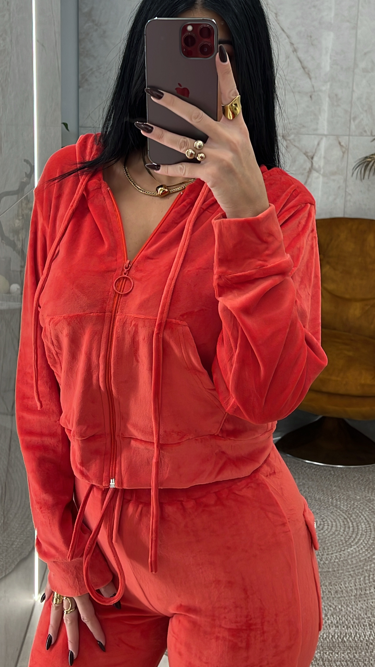 Η ζακέτα διαθέτει ι κουκούλα έχει τσέπες μπροστά και λάστιχο στα μανίκια το παντελόνι έχει λάστιχο και κορδόνι στην μέση και έχει τσέπες πίσω.