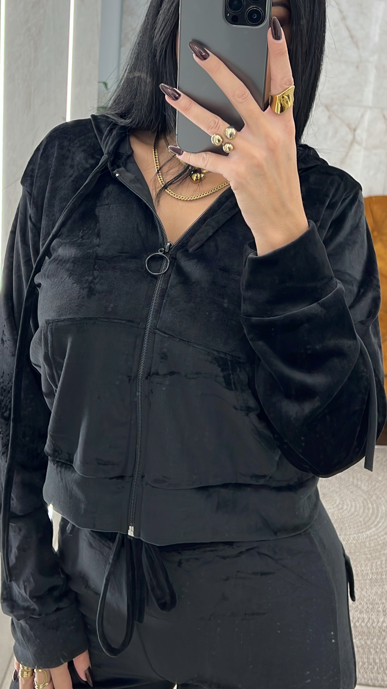 Η ζακέτα διαθέτει ι κουκούλα έχει τσέπες μπροστά και λάστιχο στα μανίκια το παντελόνι έχει λάστιχο και κορδόνι στην μέση και έχει τσέπες πίσω.