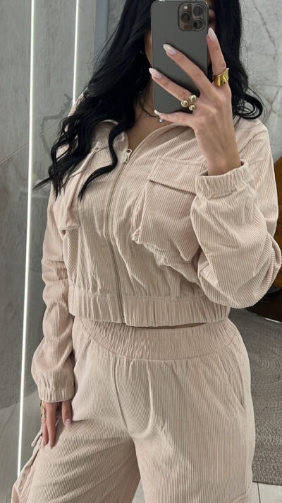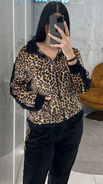 Σετ βελουτέ με animal λεπτομέρειες. Η ζακέτα κλείνει με φερμουάρ και το παντελόνι διαθέτει λάστιχο και κορδόνι στην μέση έχει τσέπες και εσωτερικά έχει επένδυση