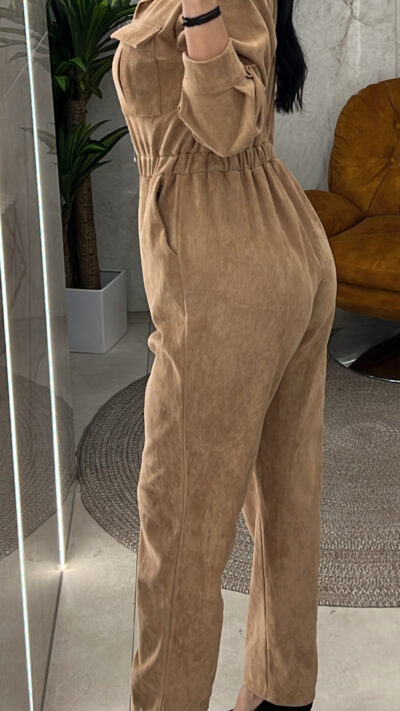 Ολόσωμη φόρμα suede με λάστιχο στη μέση. Κλείνει με κουμπιά και διαθέτει τσέπες.