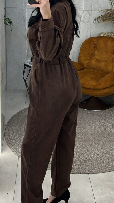 Ολόσωμη φόρμα suede με λάστιχο στη μέση. Κλείνει με κουμπιά και διαθέτει τσέπες.