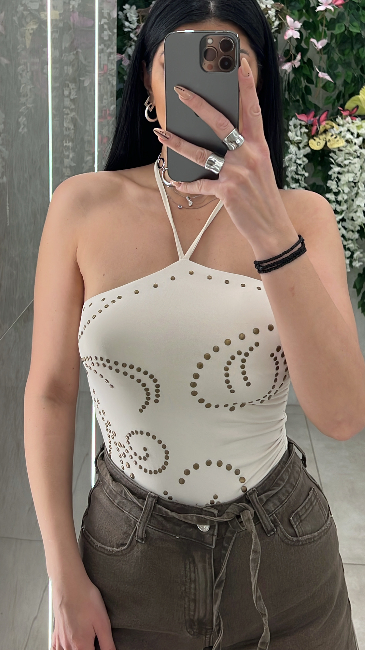 Τοπ με τρουκς , δενει στον λαιμο , διαθετει καπς στο στηθος και ειναι άνισο στο τελειωμα .