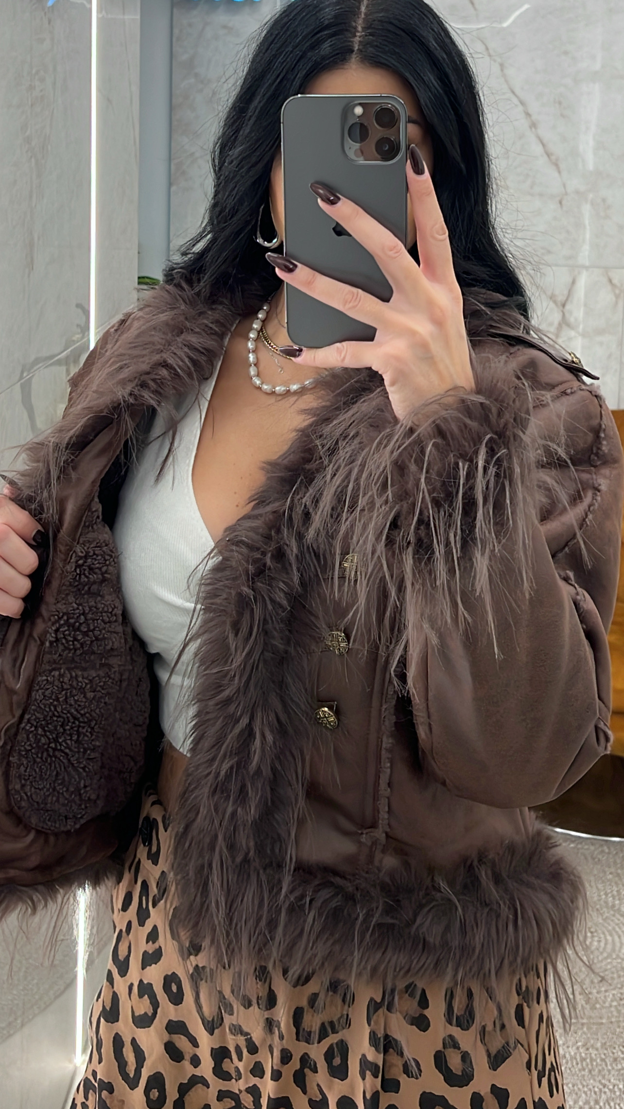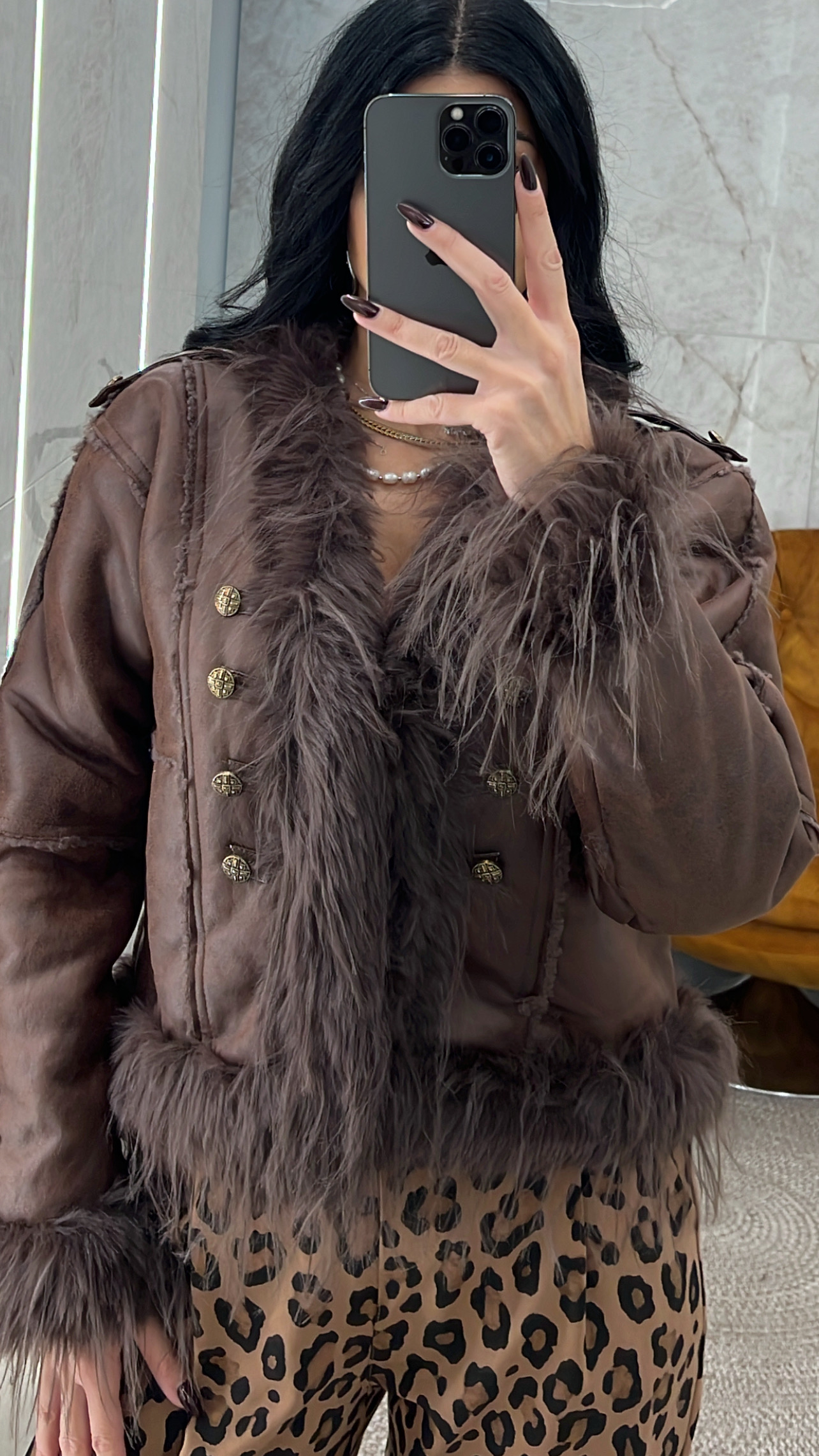 Τζάκετ καφέ με εσωτερική γούνα και λεπτομέρειες με κουμπιά χρυσά μπροστά διακοσμητικά δεν κλείνει μπροστά