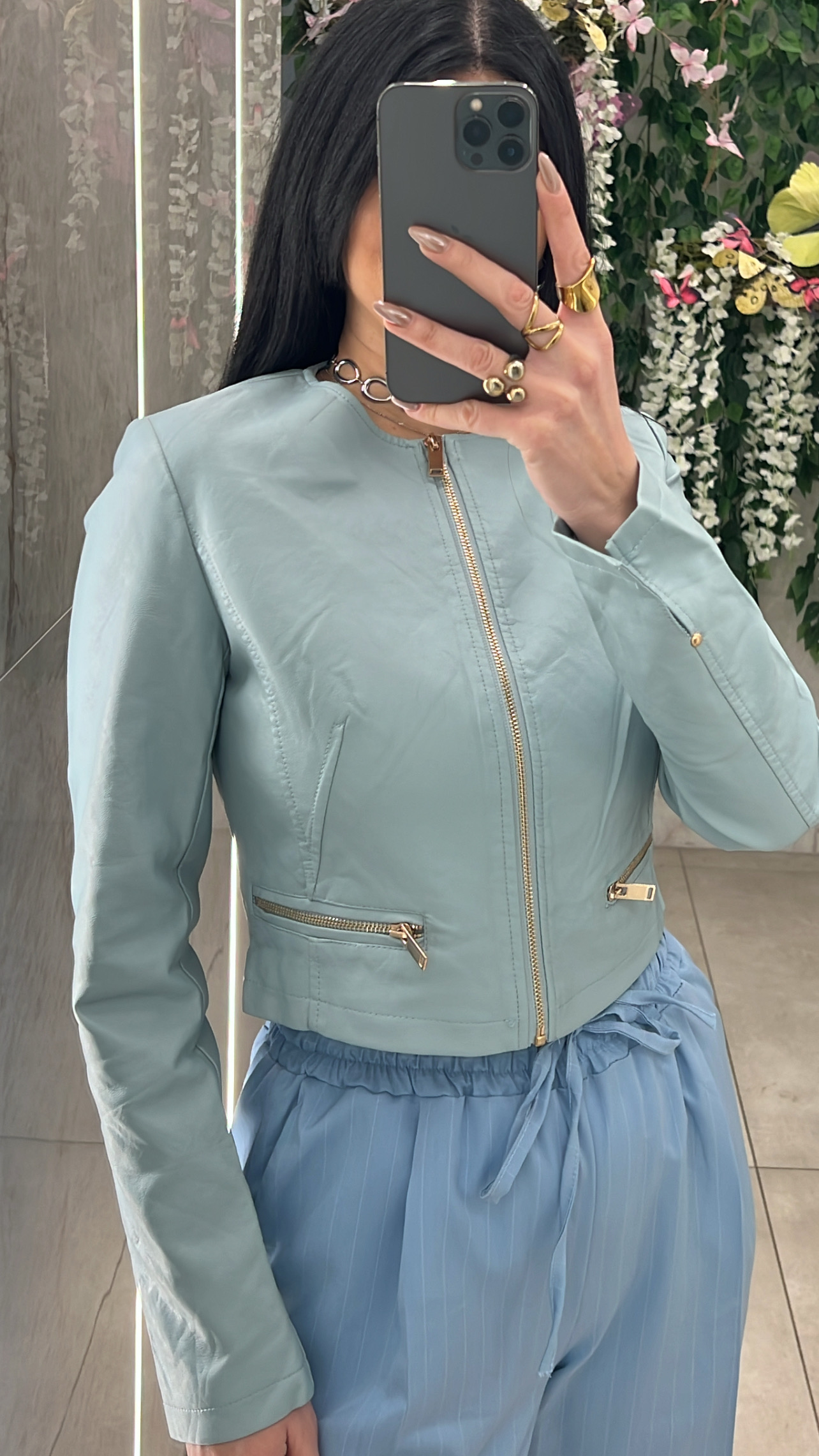 Τζακετ δερματινη με λαιμοκοψη , διαθέτει τσέπες ,εσωτερικη φόδρα και κλεινει με φερμουαρ .