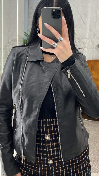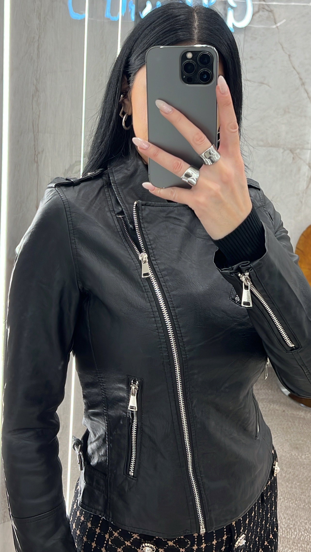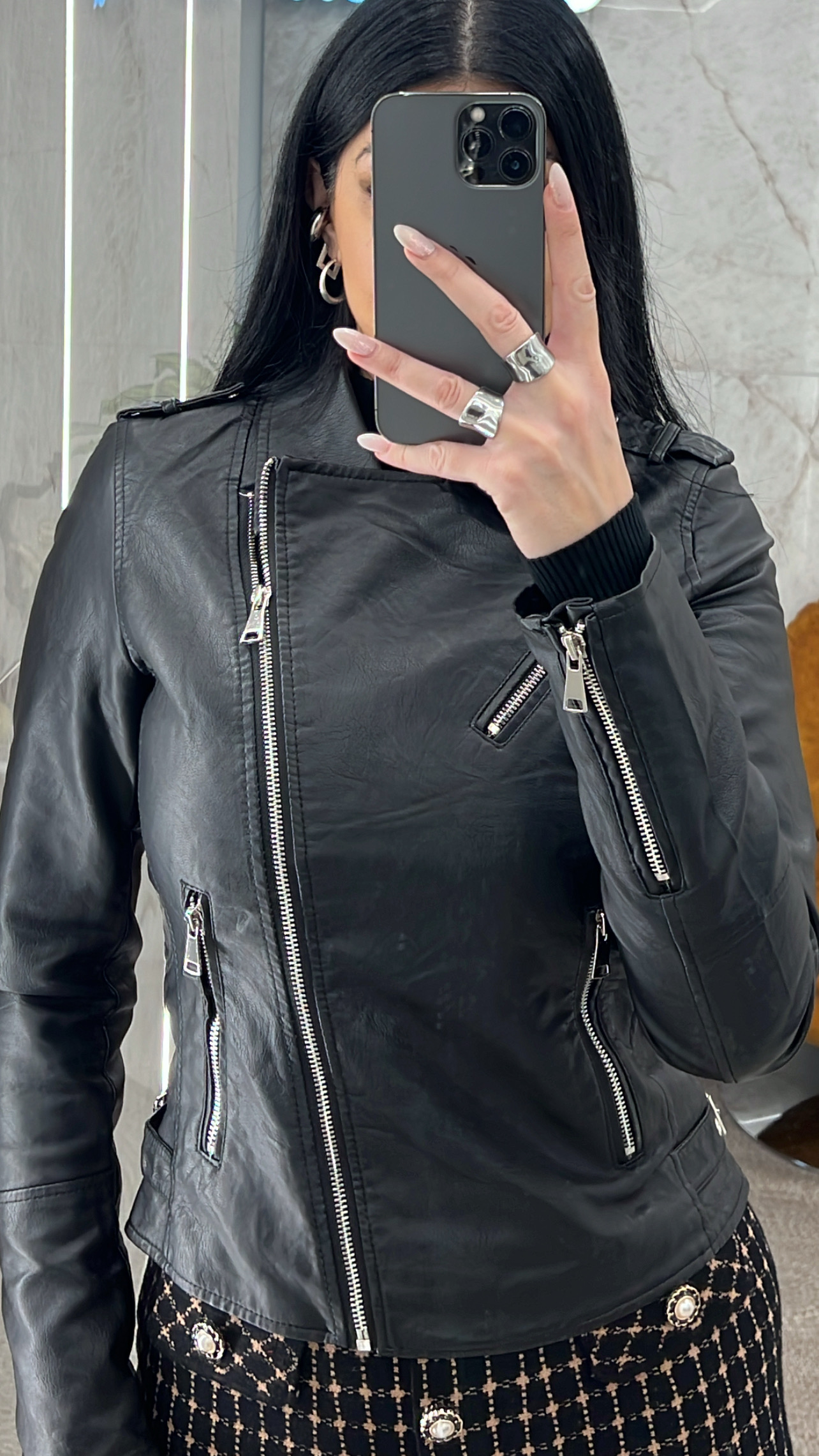 Τζάκετ δερματίνη/μαύρο με φερμουάρ στα μανίκια. Είναι φοδραρισμένο, διαθέτει τσέπες και κλείνει λοξά με φερμουάρ.