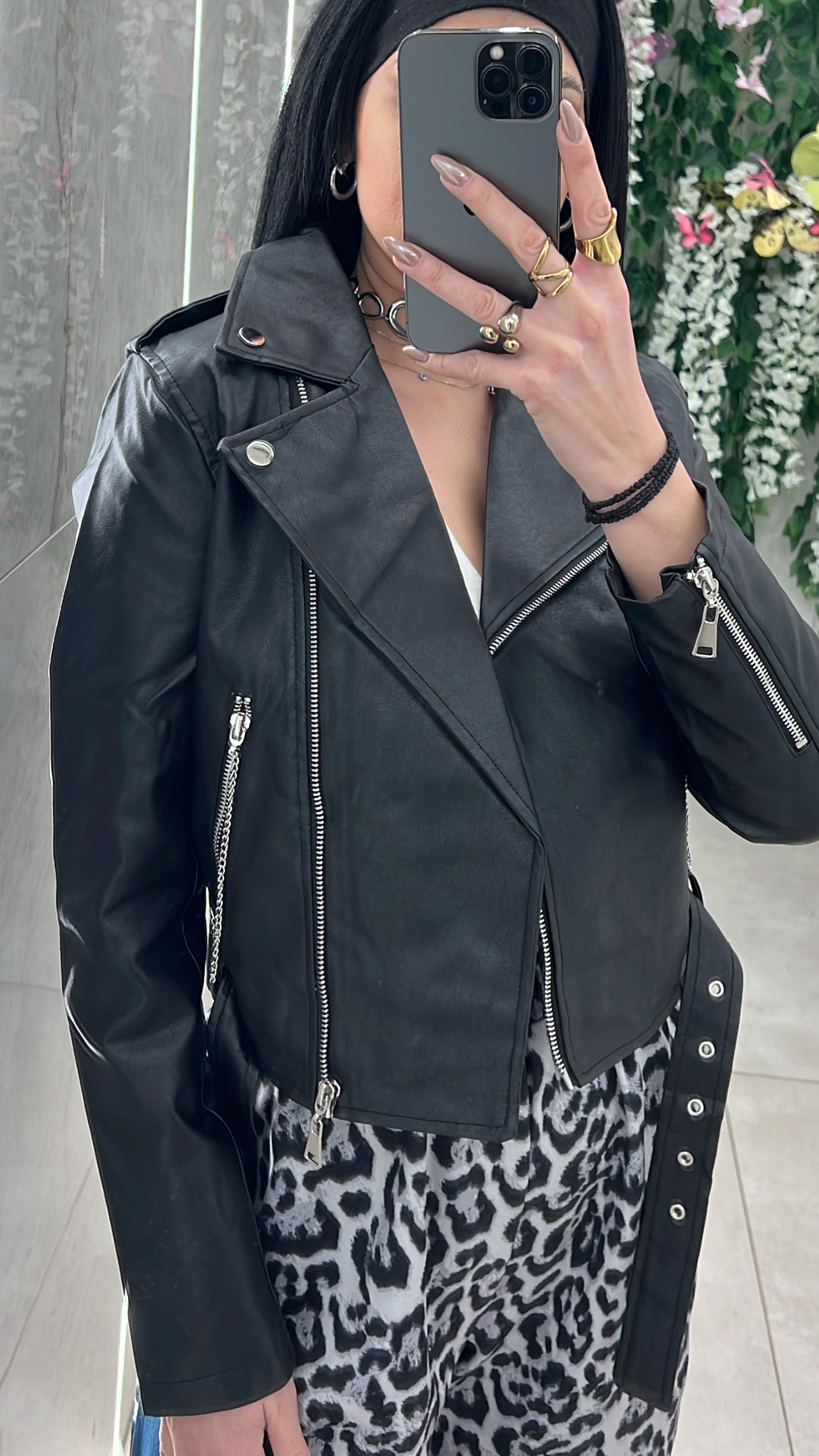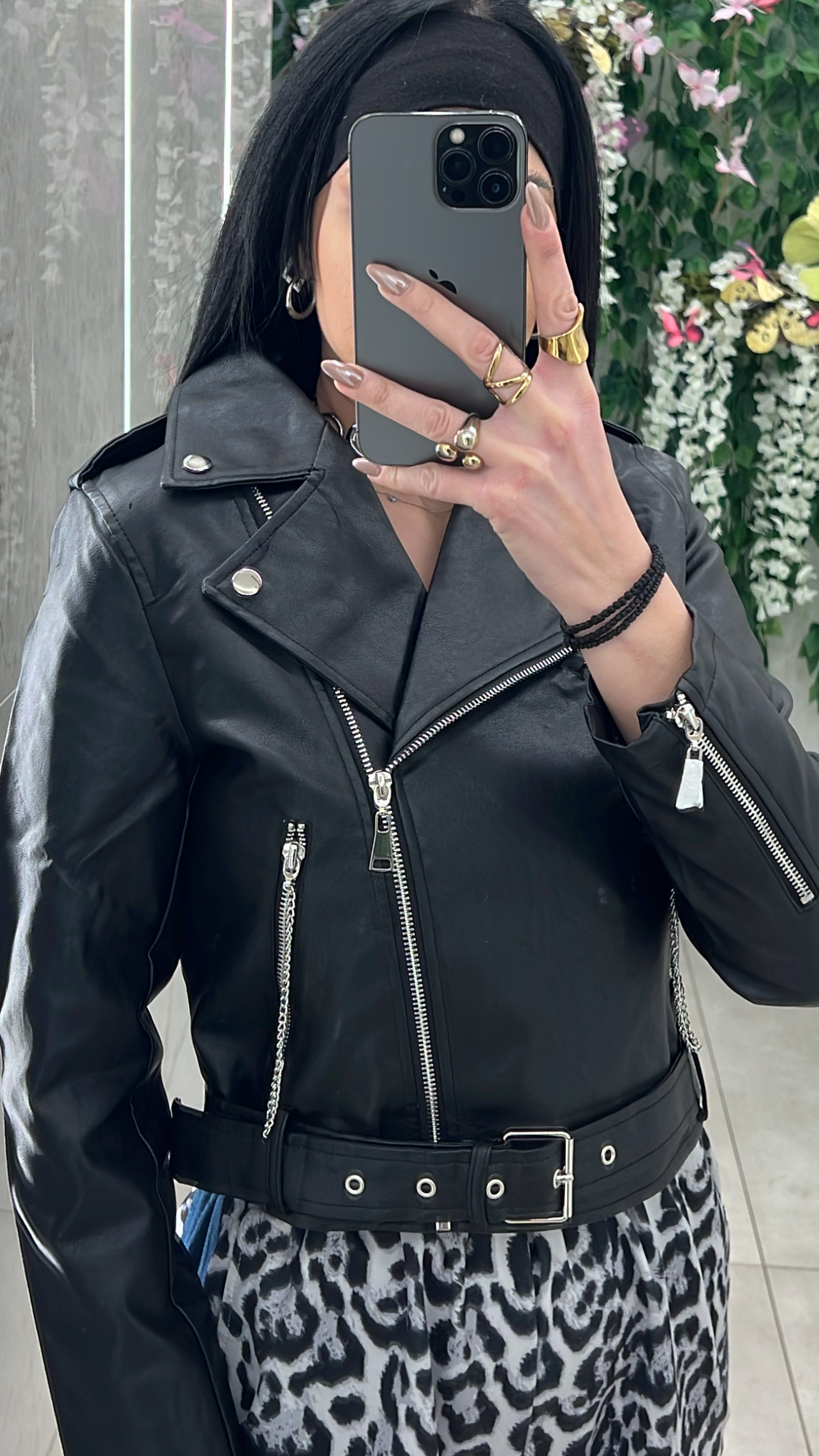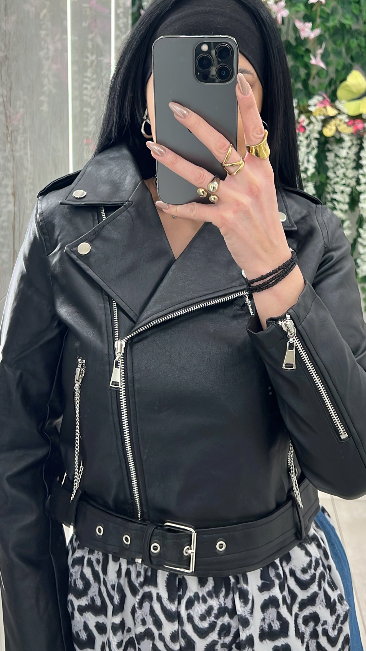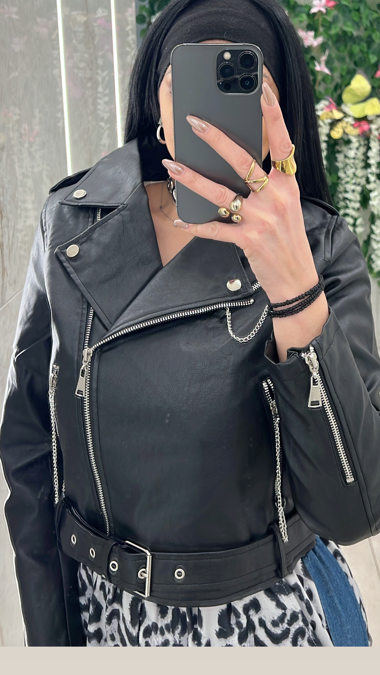 Τζάκετ δερματίνη με δικη του ζώνη ,τσέπες ,εσωτερικη φόδρα και λεπτομέρειες με αλυσίδα .