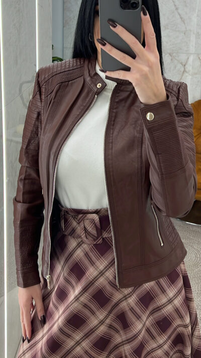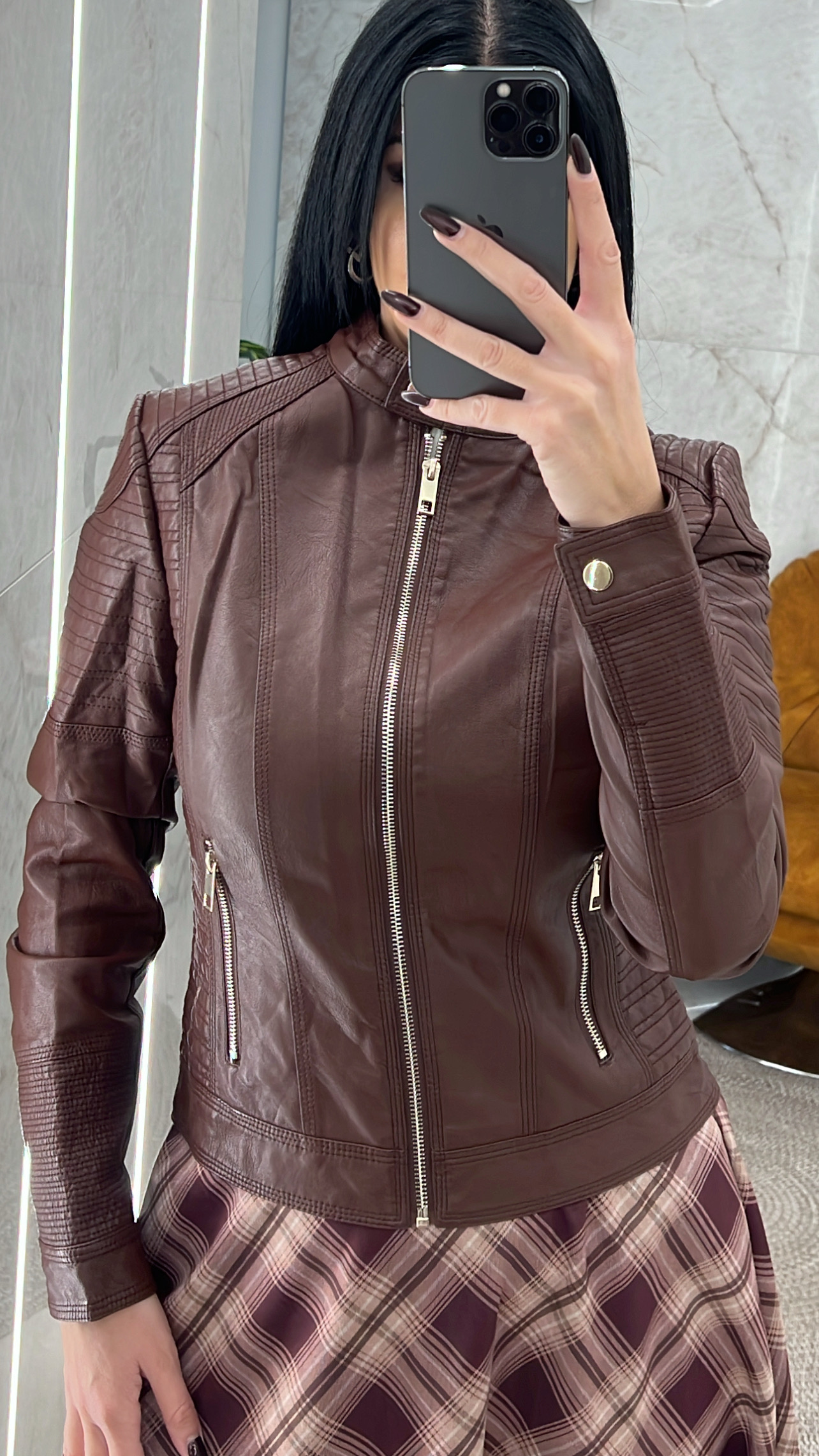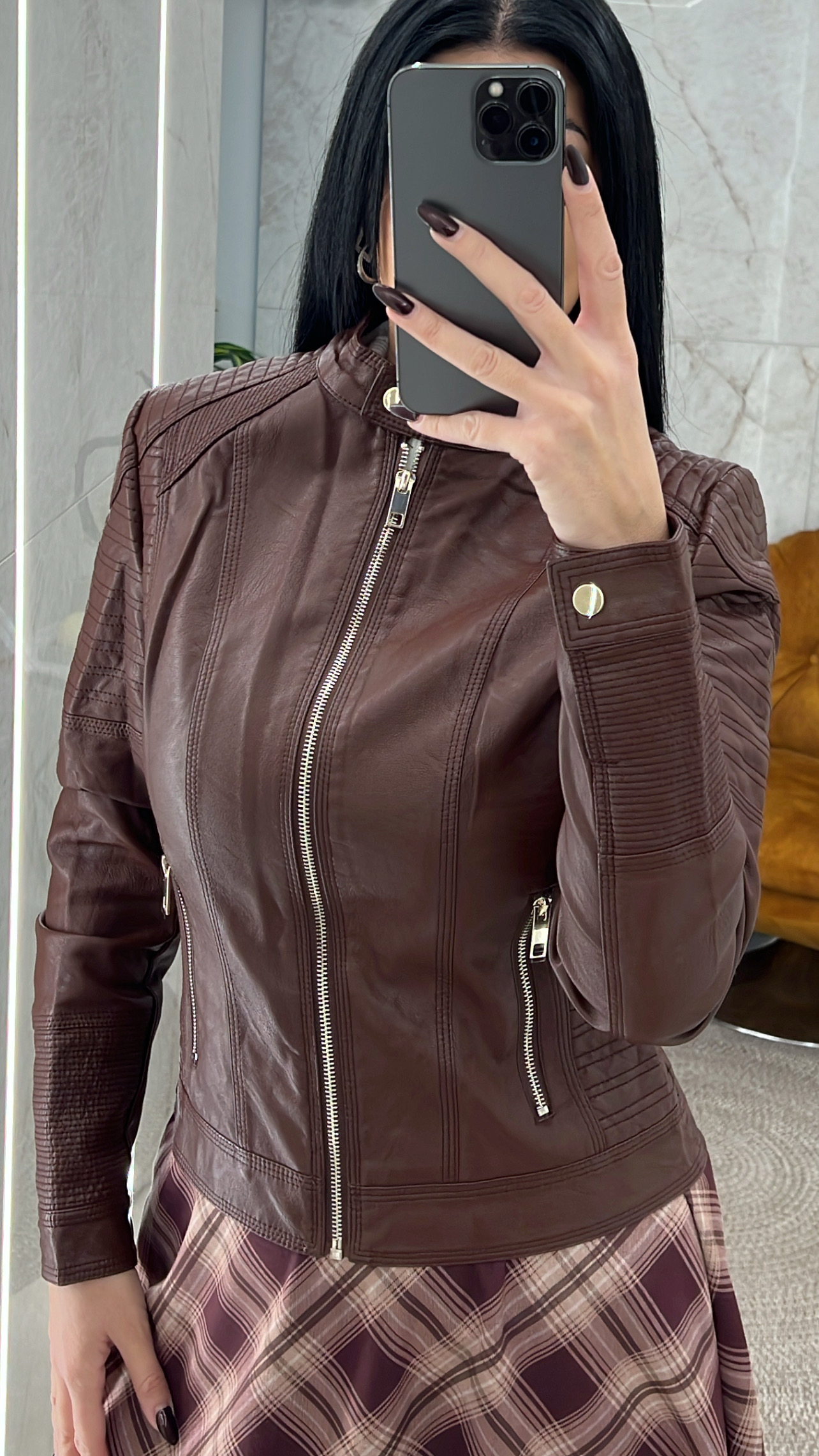 Τζάκετ δερματίνη/μαύρο με mao γιακά σε στενή γραμμή, με διακοσμητικές ραφές είναι φοδραρισμένο διαθέτει τσέπες και κλείνει με φερμουάρ.