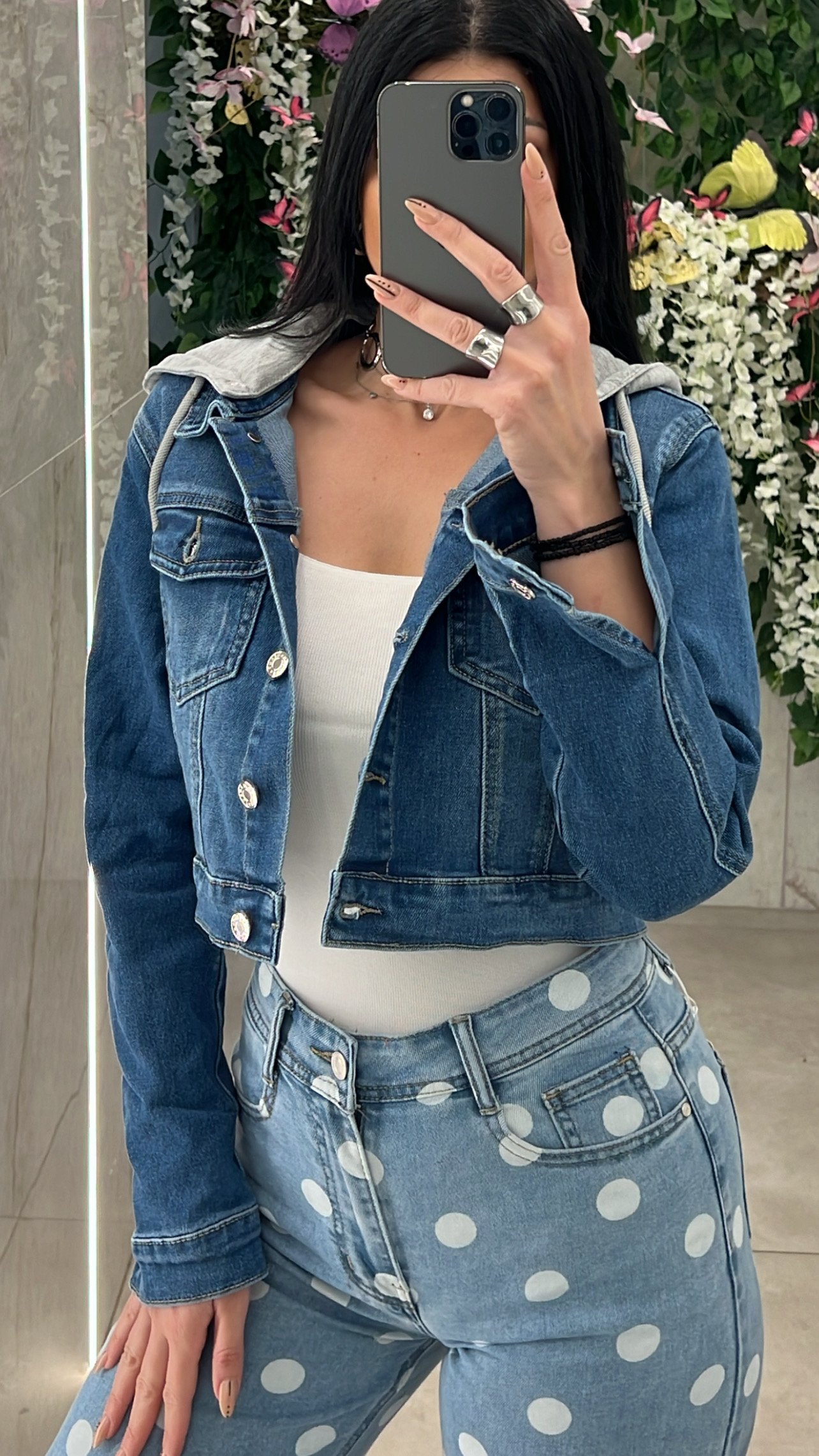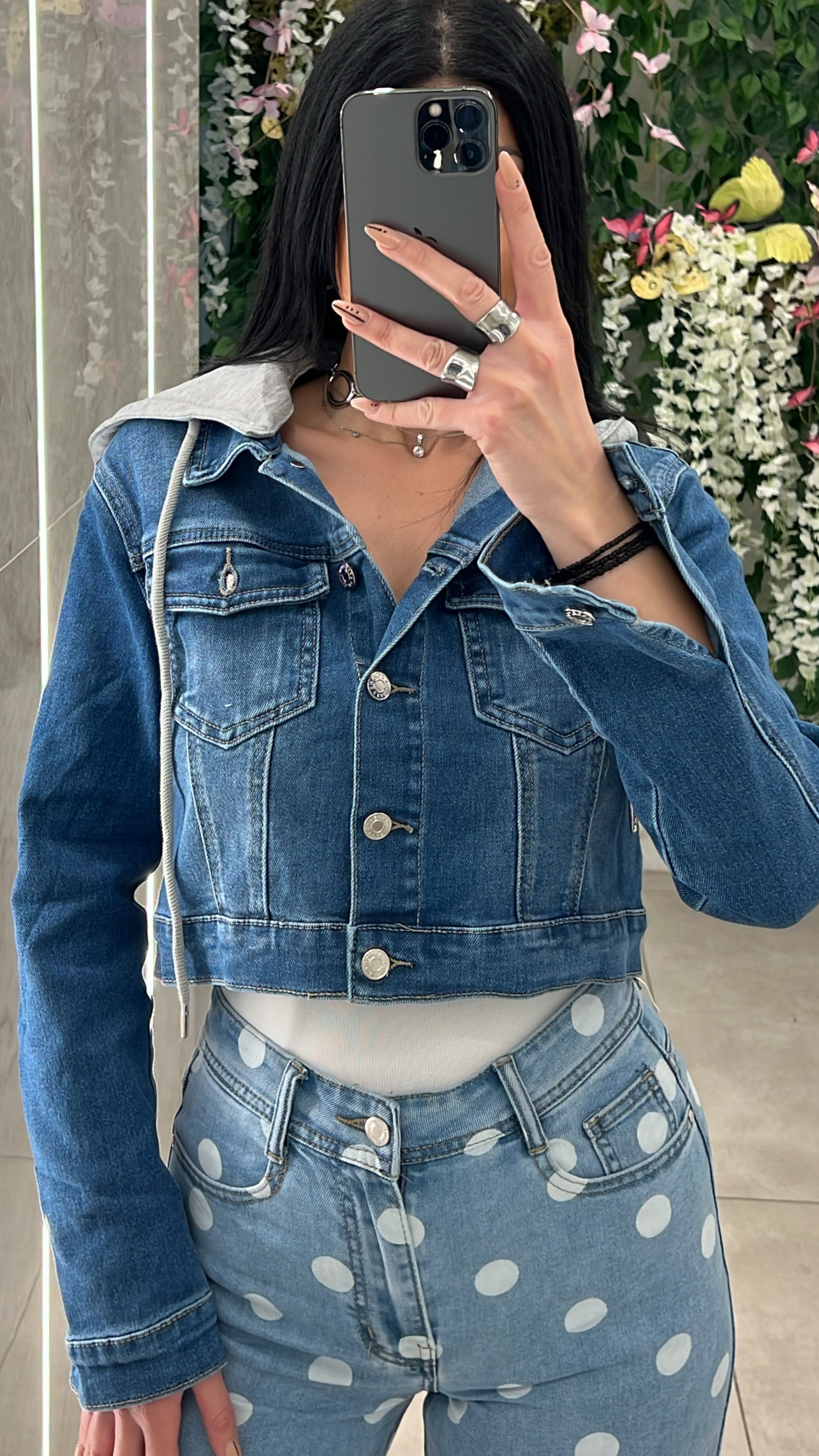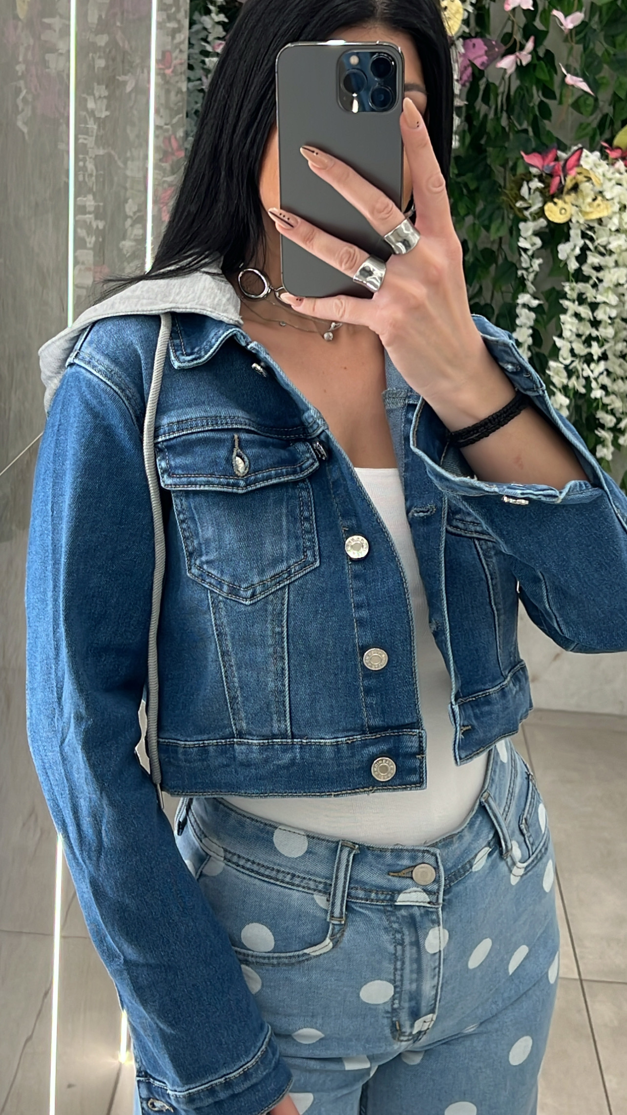 Τζιν τζακετ κοντο με αποσπόμενη κουκουλα και τσέπες .