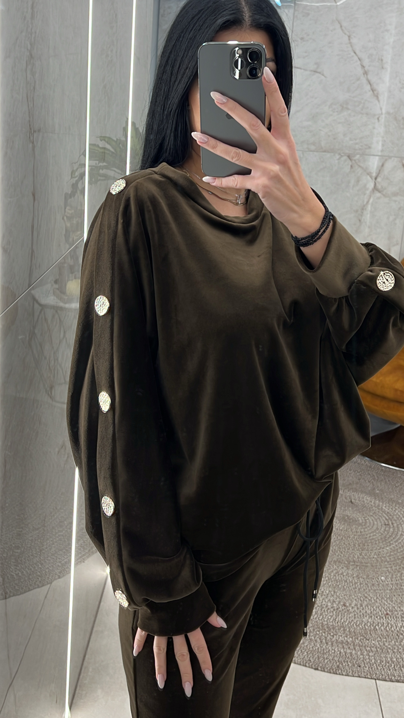 Βελουτέ Σετ Φόρμας με Κουμπιά/Καφέ