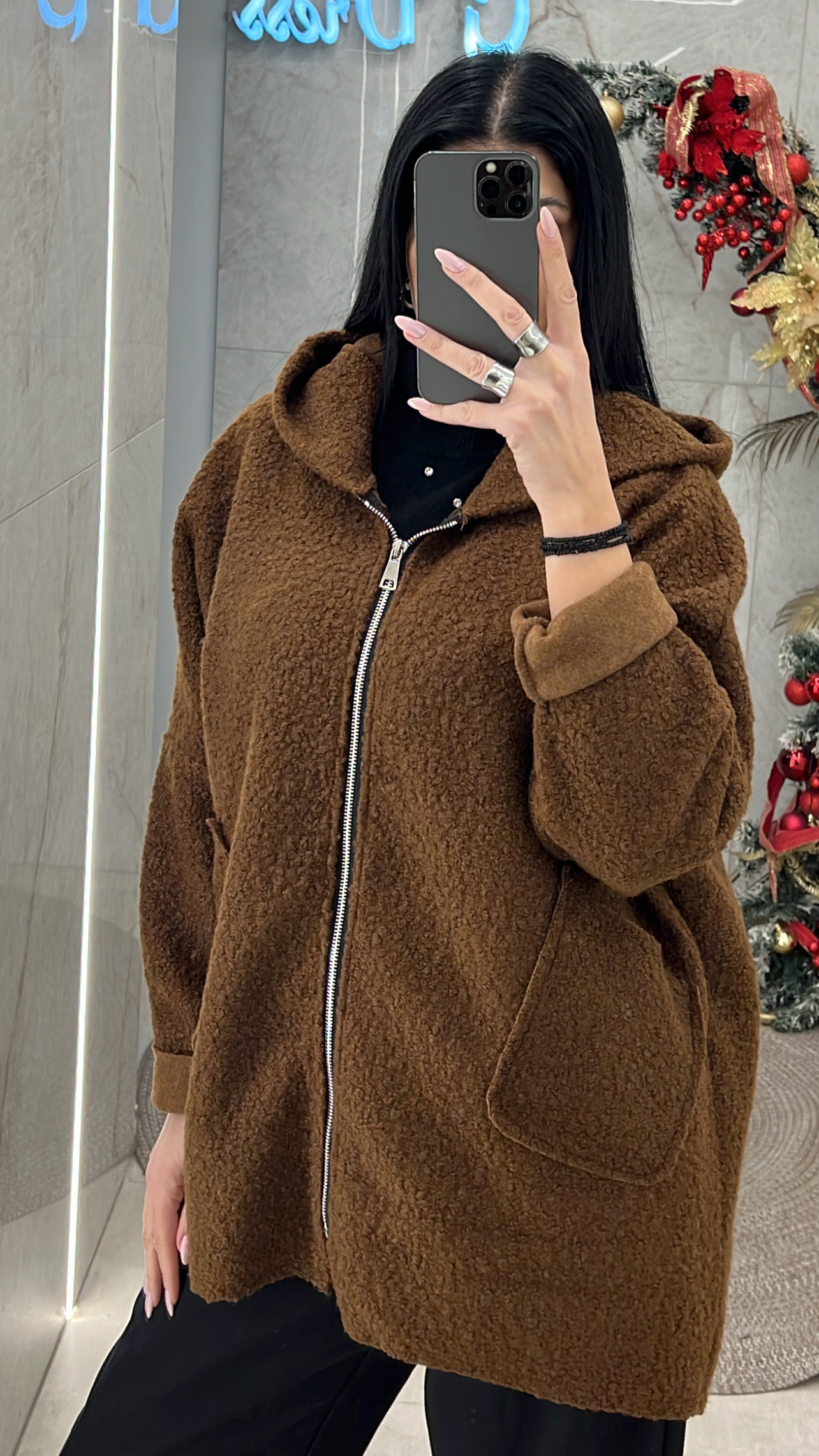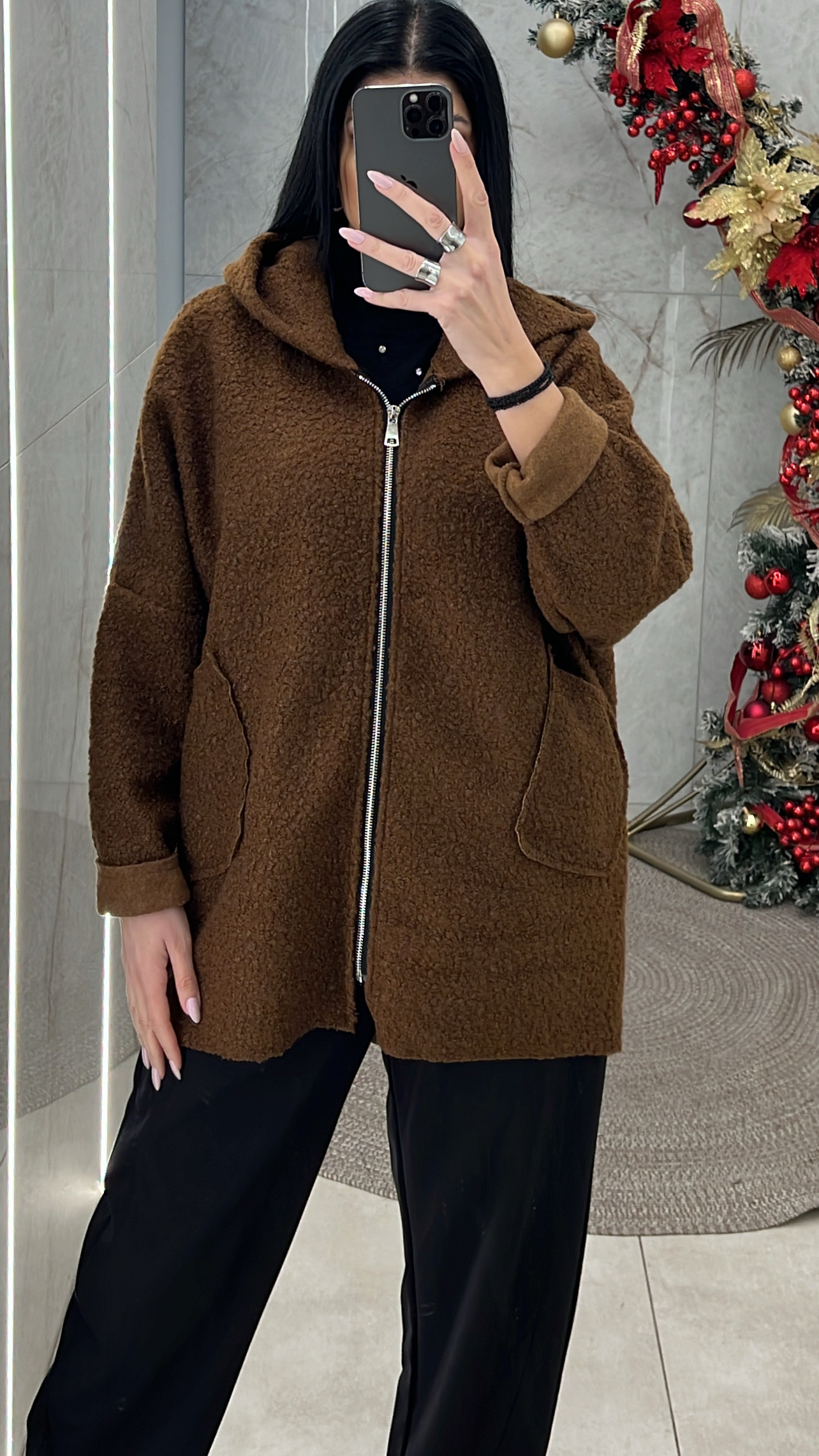 Ζακέτα μπουκλέ με κουκούλα κλείνει με φερμουάρ και έχει τσέπες είναι λίγο πιο κοντή μπροστά
