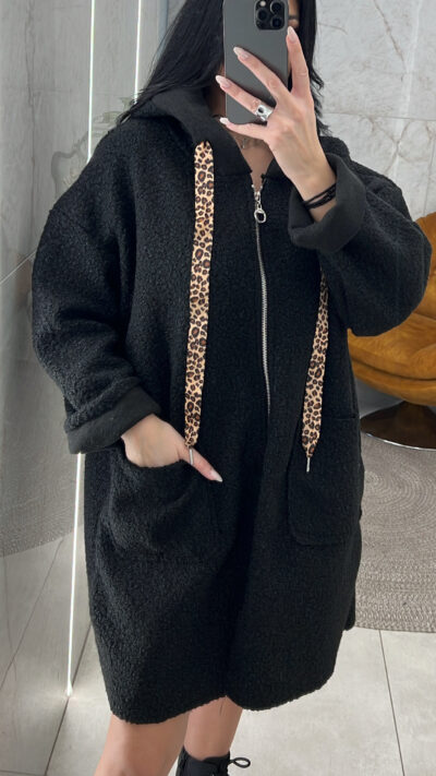 Ζακέτα μπουκλέ με κουκούλα και κορδόνι λεοπάρ ,με τσέπες και φερμουάρ.
