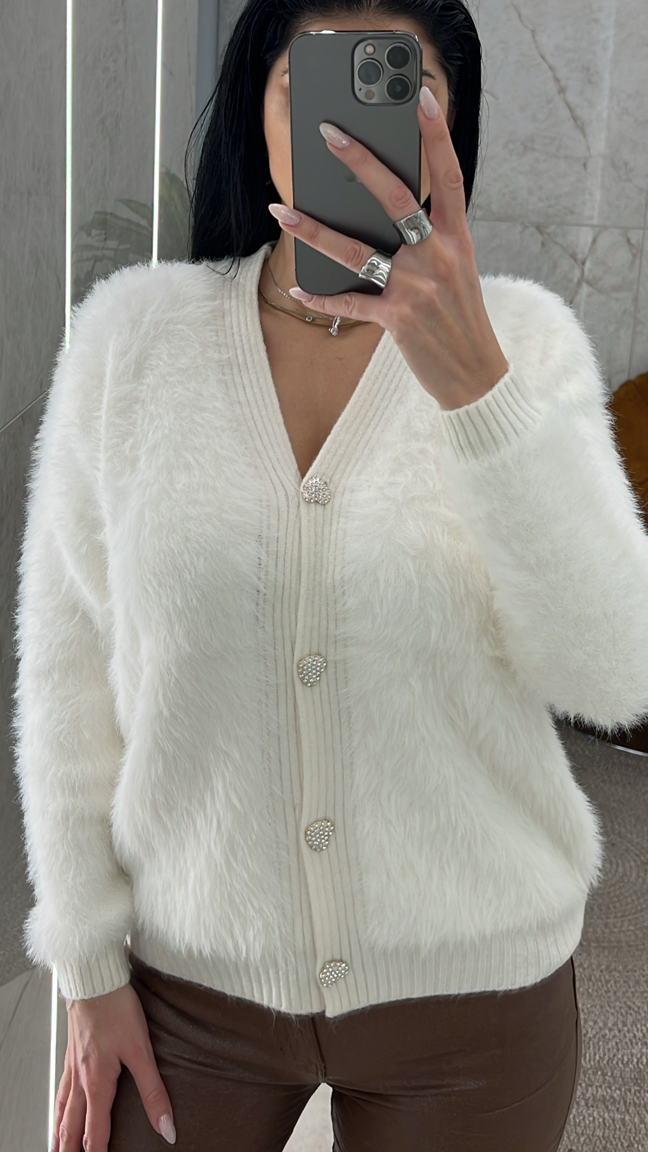 Ζακέτα χνουδωτή με κουμπιά σε σχήμα καρδιάς και στρας