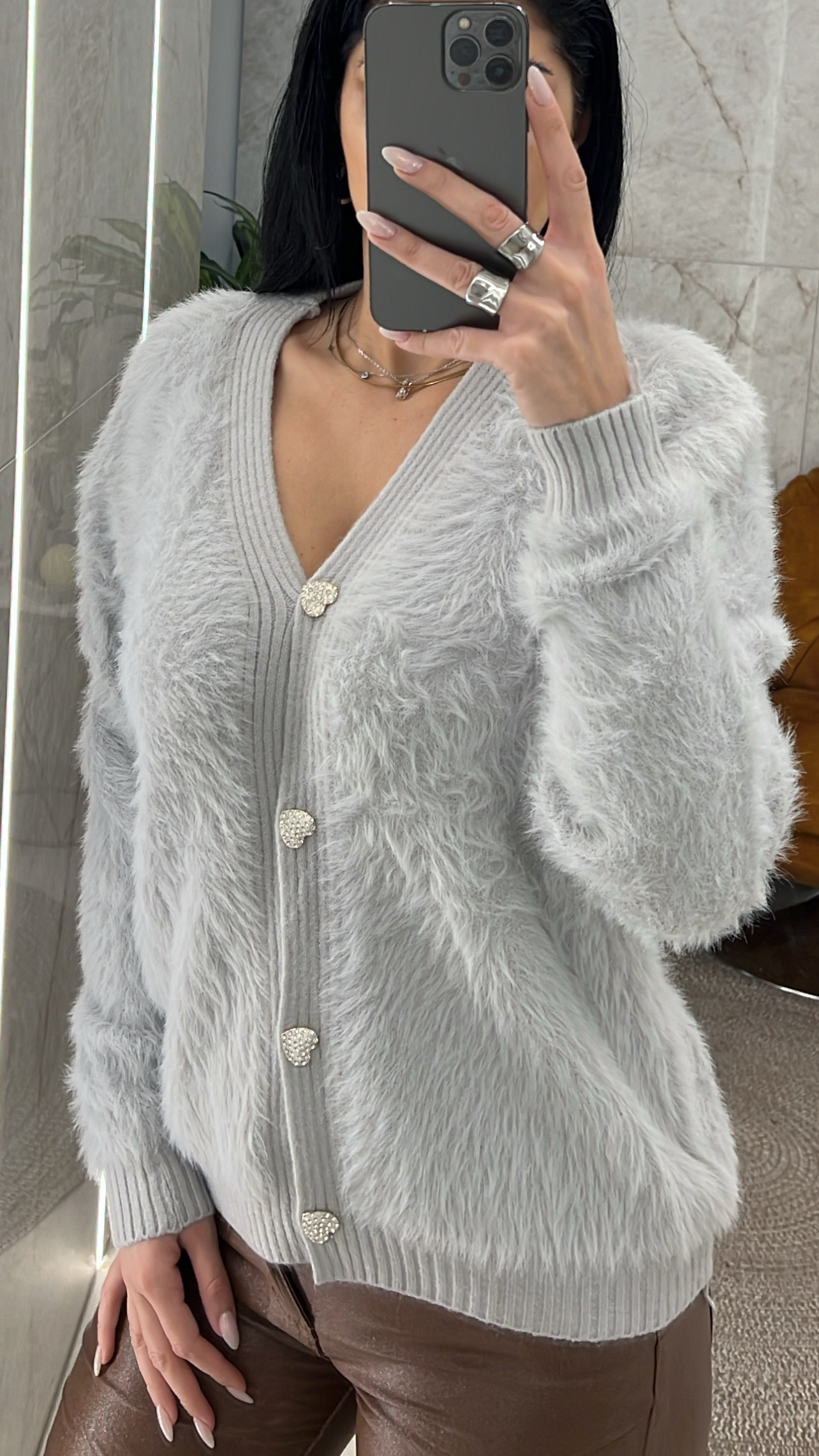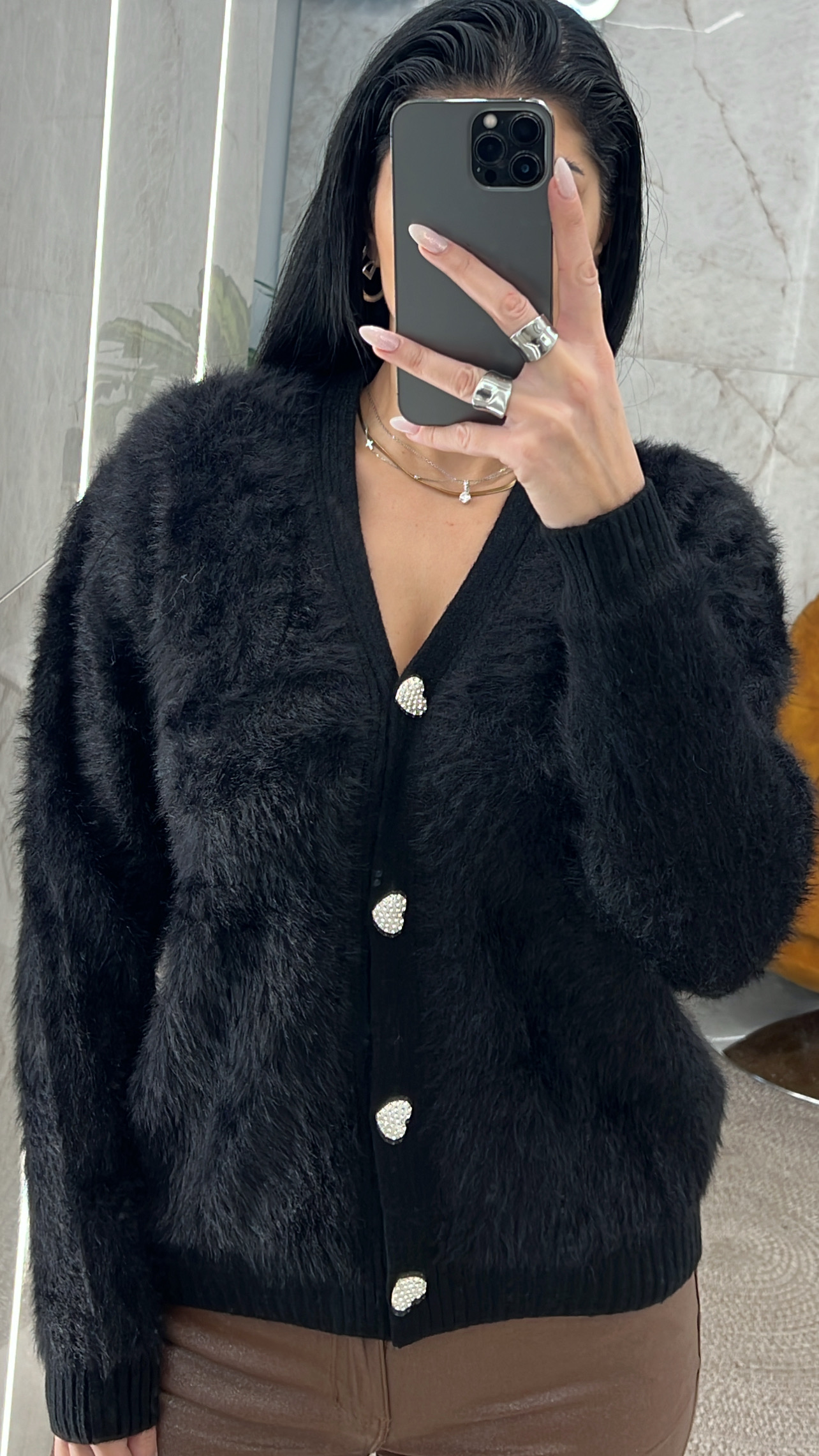 Ζακέτα χνουδωτή με κουμπιά σε σχήμα καρδιάς και στρας