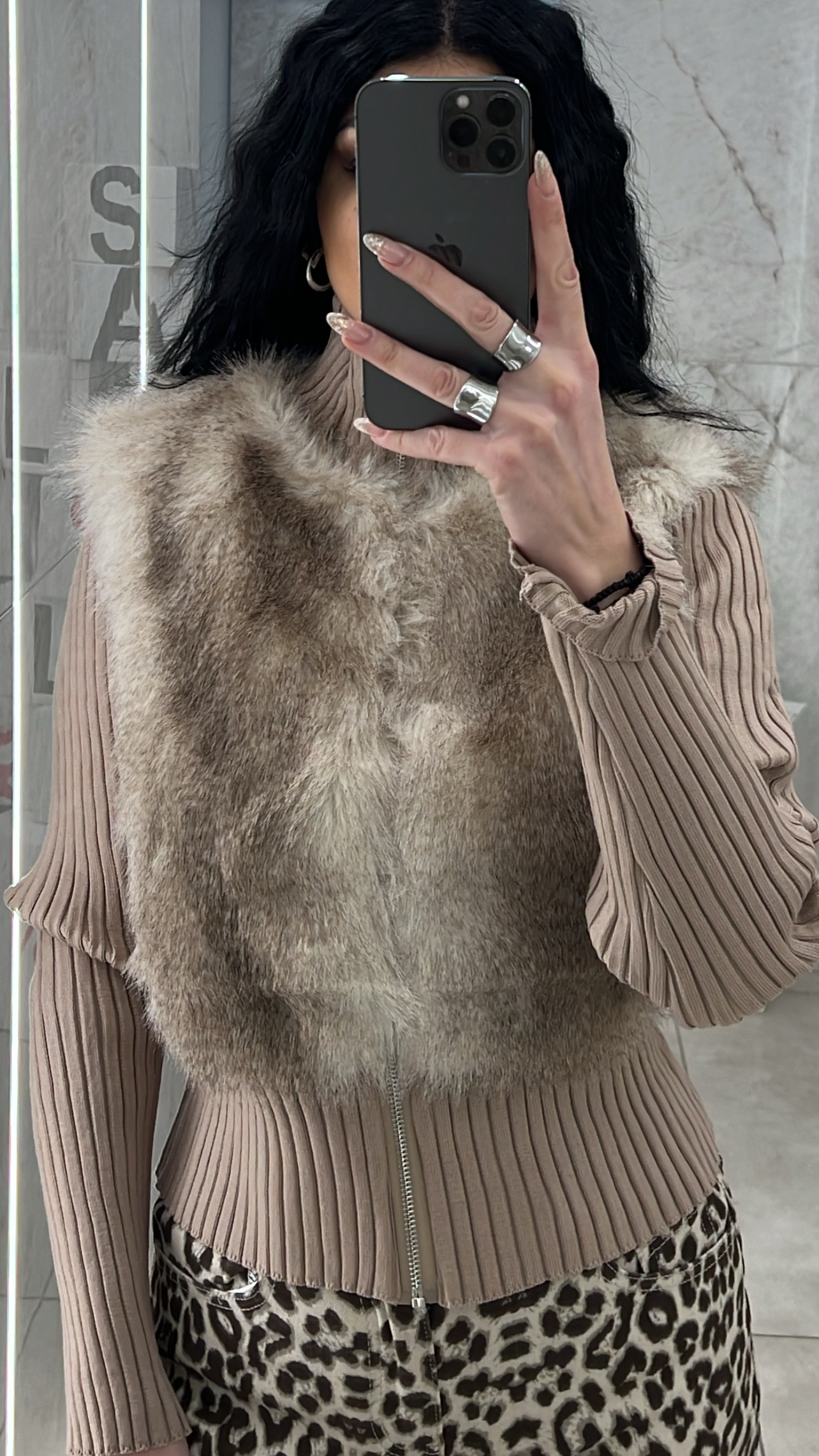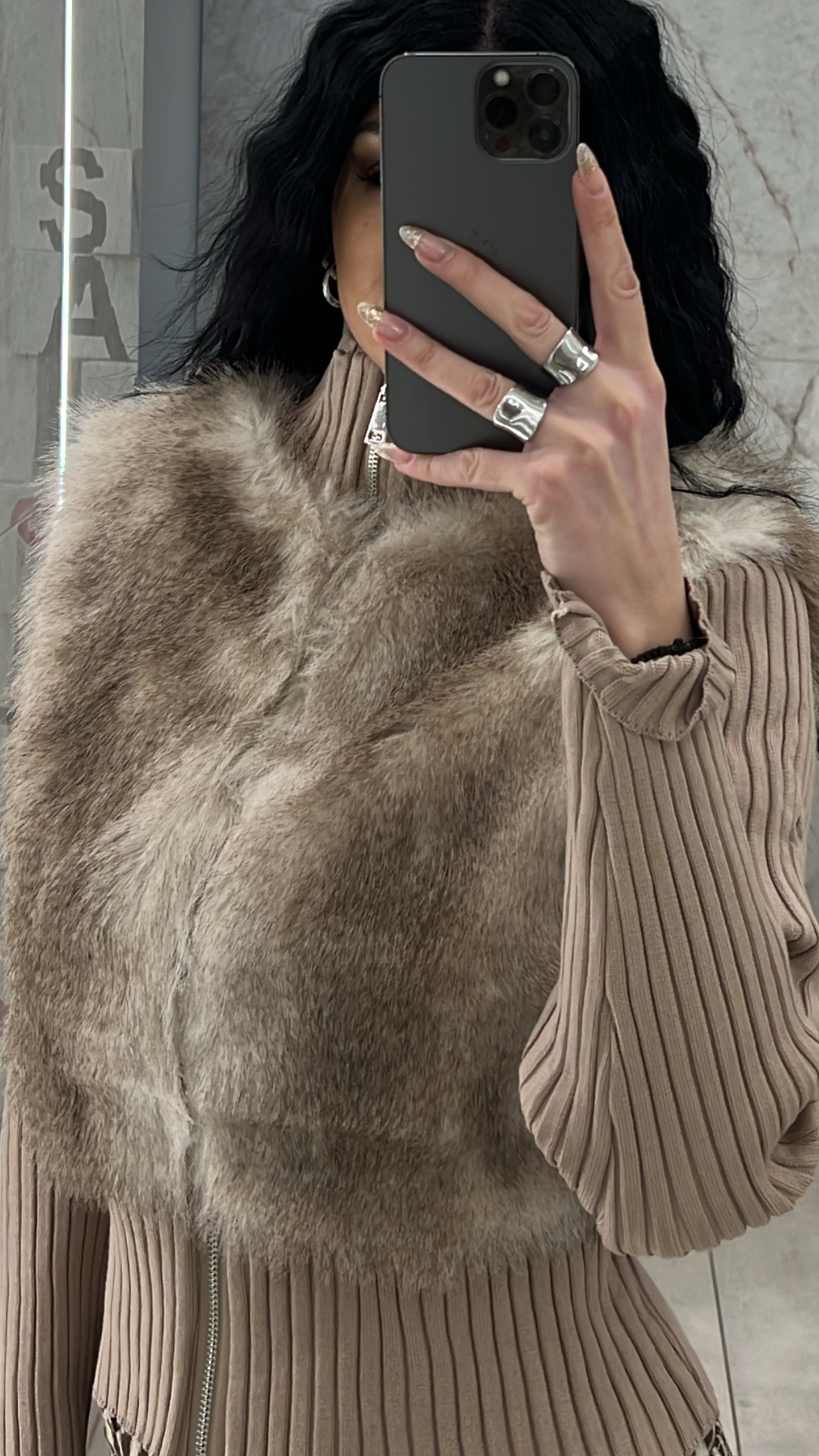 Ζακέτα γούνινη με πλεκτά μανίκια , κλείνει με φερμουάρ και διαθέτει εσωτερική φόδρα.