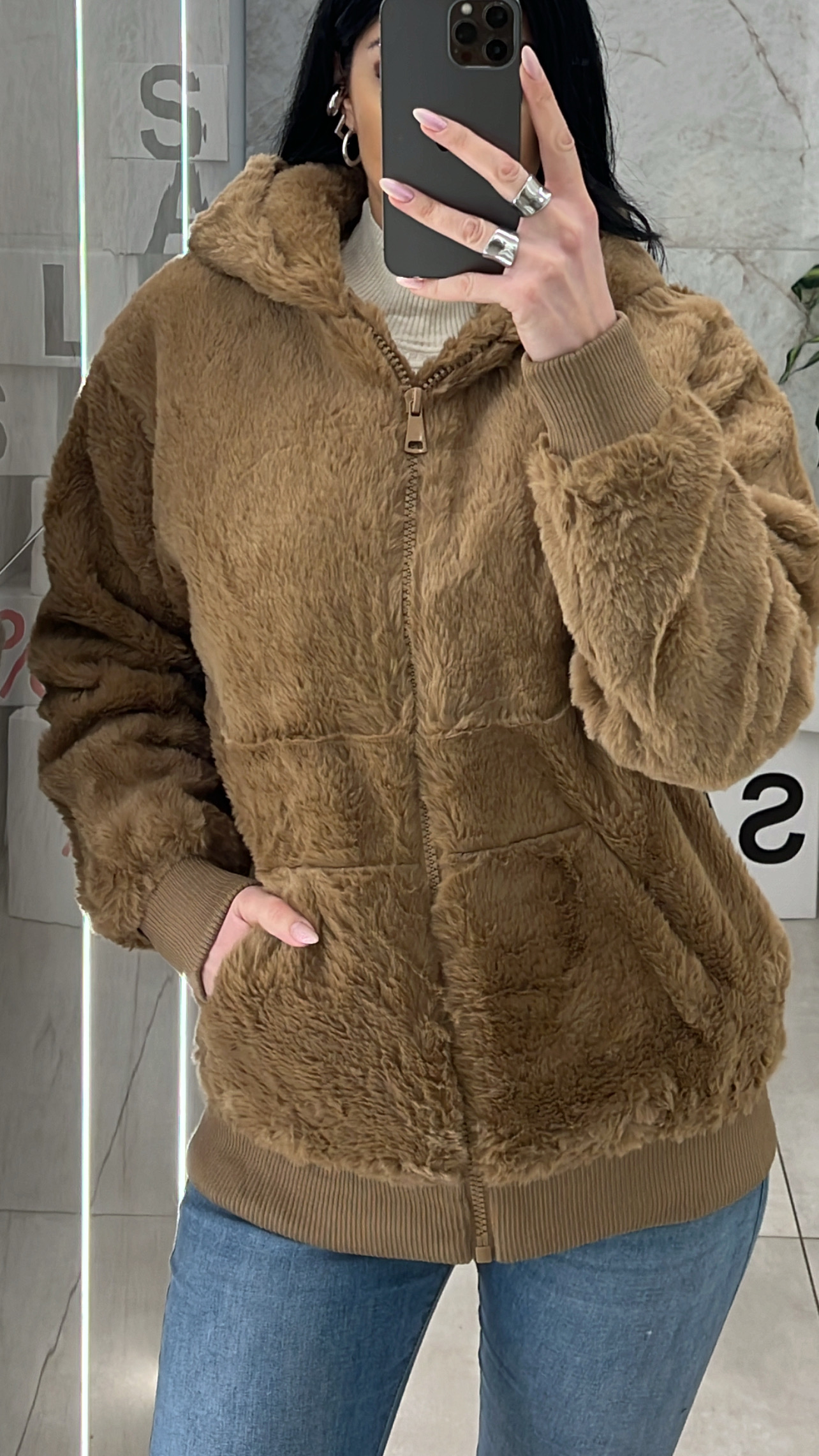 Ζακέτα γούνινη με κουκούλα και τσέπες , κλείνει με φερμουάρ και διαθετει εσωτερική φόδρα και λάστιχο στο τελείωμα  .