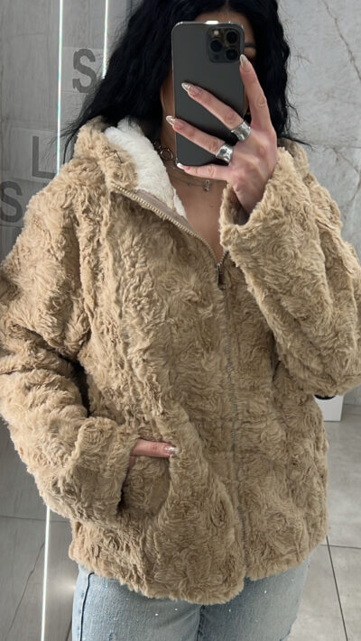 Ζακέτα γούνινη με φερμουάρ ,κουκούλα, τσέπες και διαθέτει εσωτερική γούνα .