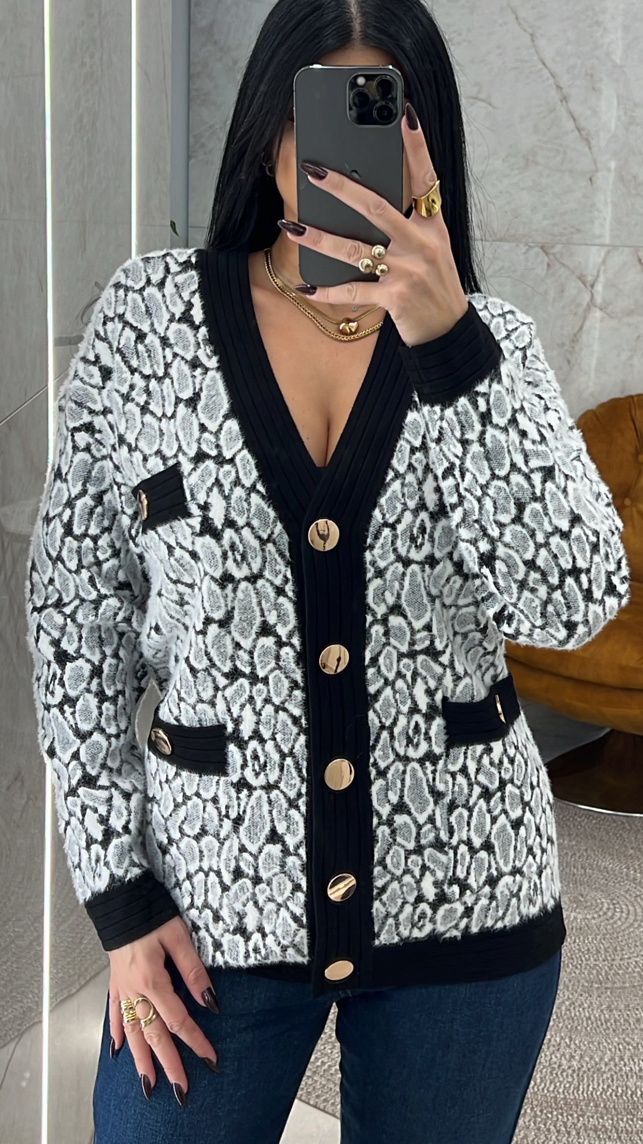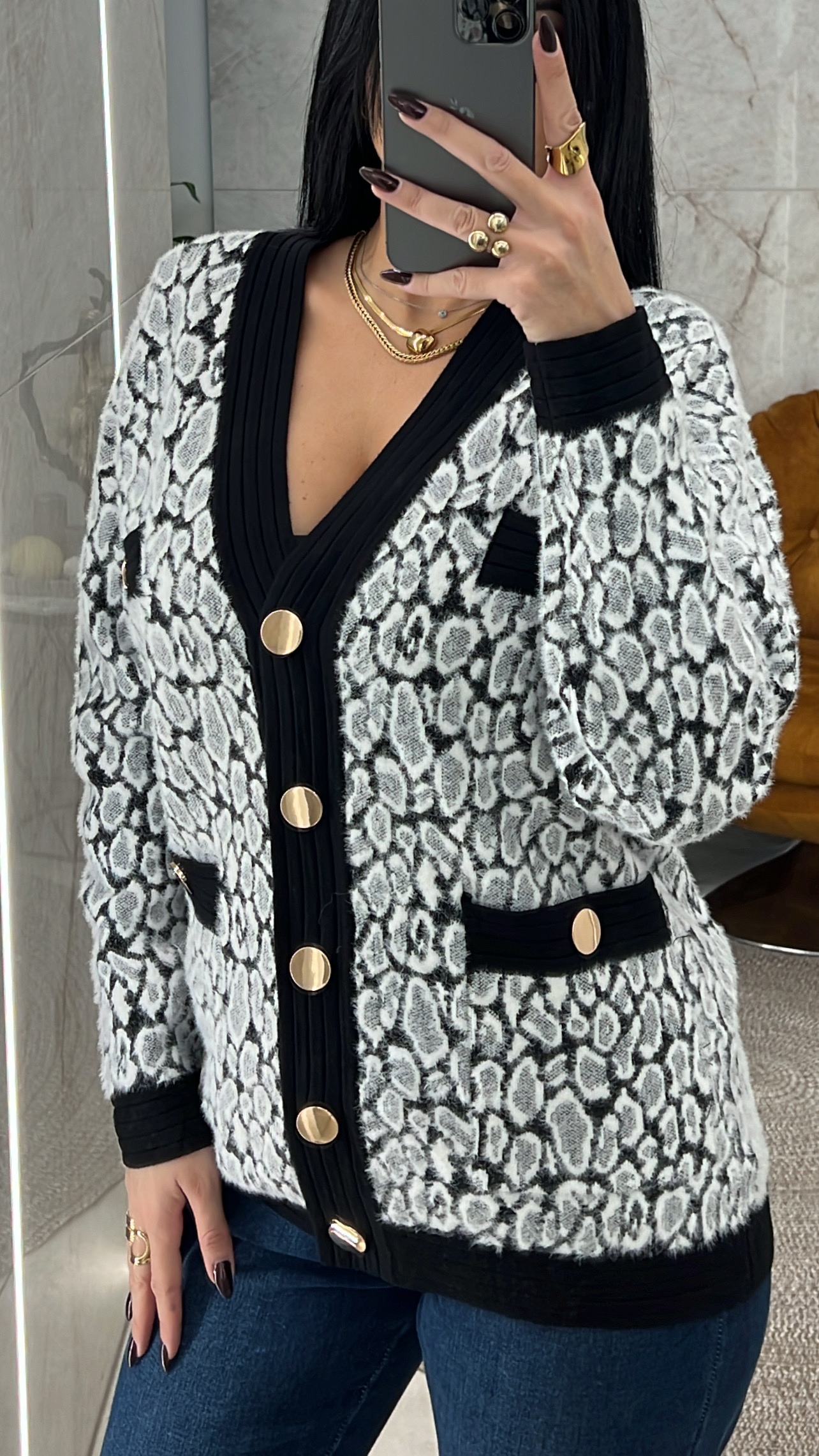 Ζακέτα μάλλινη ασπρόμαυρη με χρυσά κουμπιά και τσέπες μπροστά