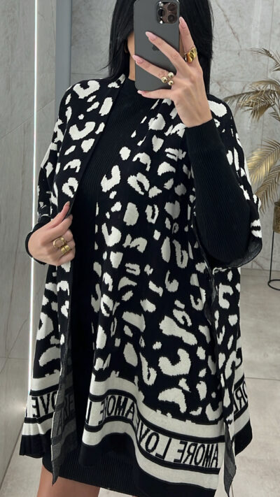 Ζακέτα πλεκτή animal print/μαύρο-άσπρο τύπου πόντσο.