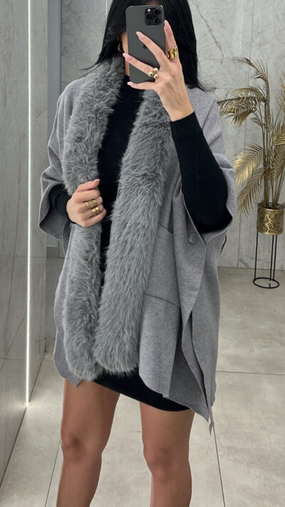 Ζακέτα πλεκτή με γούνα/γκρι τύπου πόντσο, η γούνα μπορεί να αφαιρεθεί