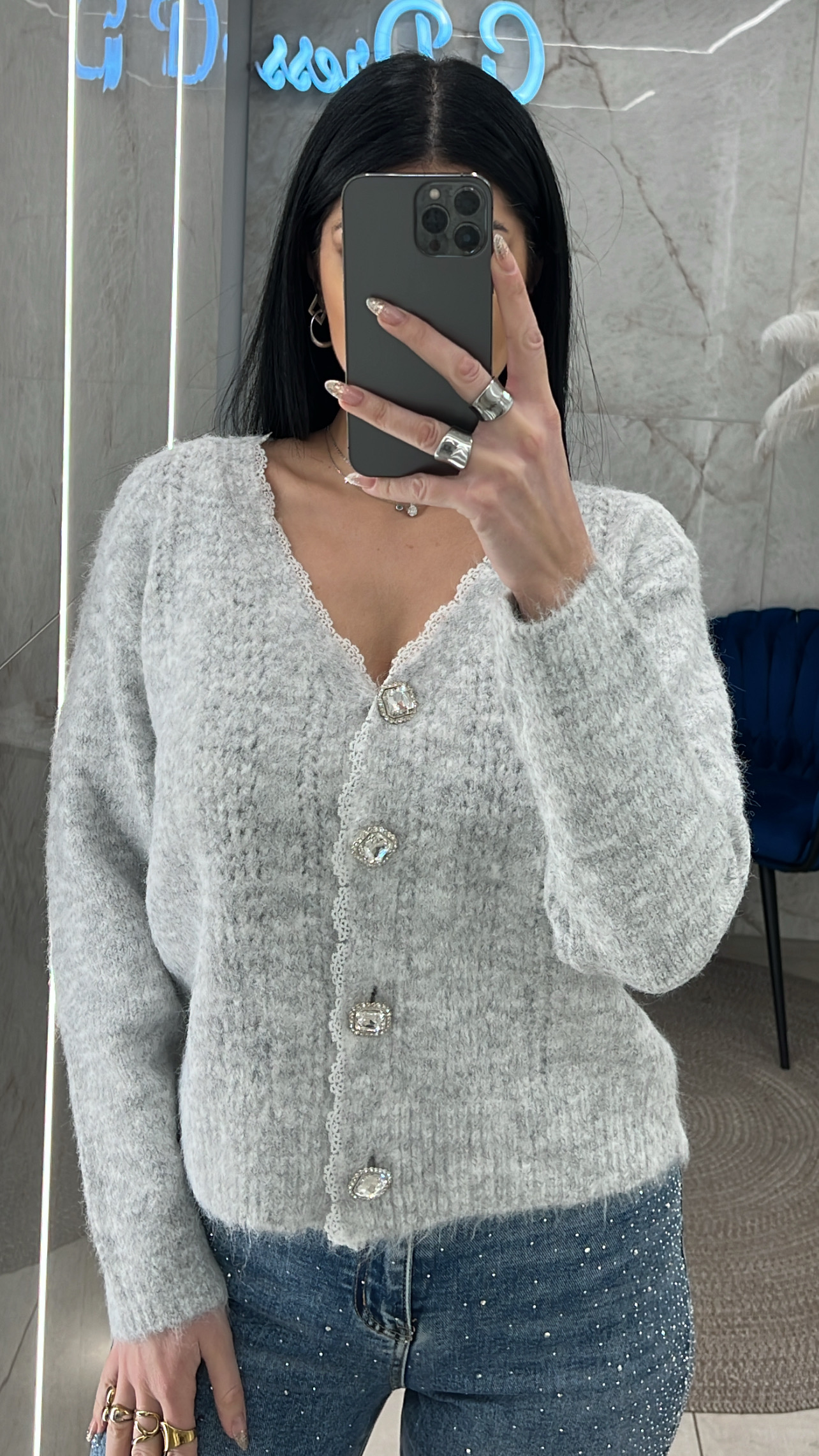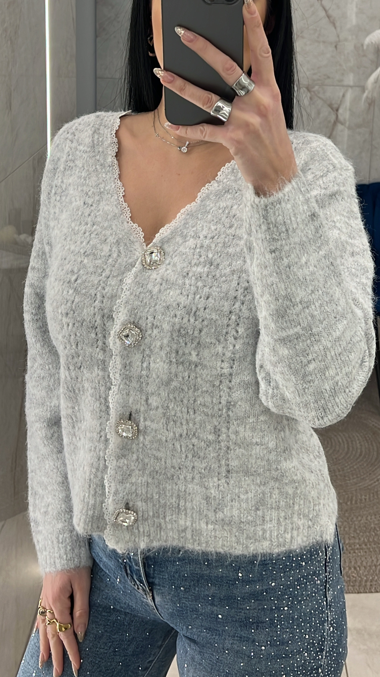 ζακέτα πλεκτή με λεπτομέρειες δαντέλας και κουμπιά με στρας