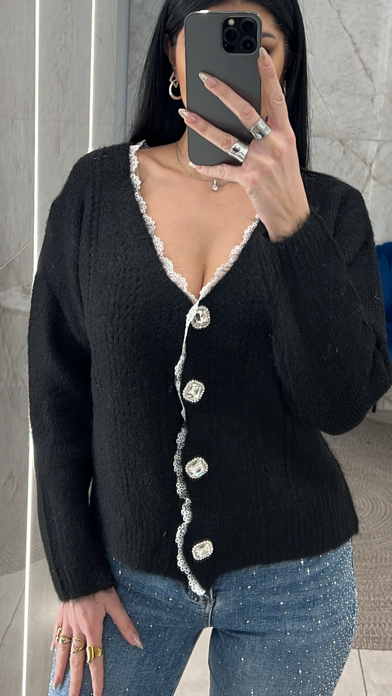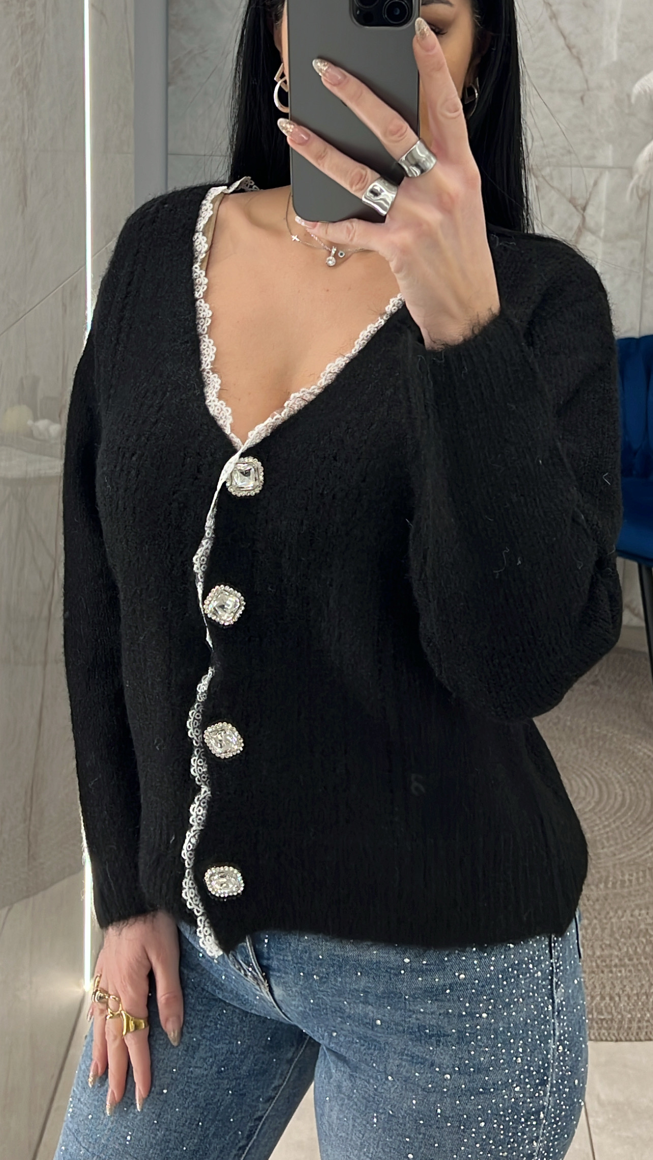 ζακέτα πλεκτή με λεπτομέρειες δαντέλας και κουμπιά με στρας