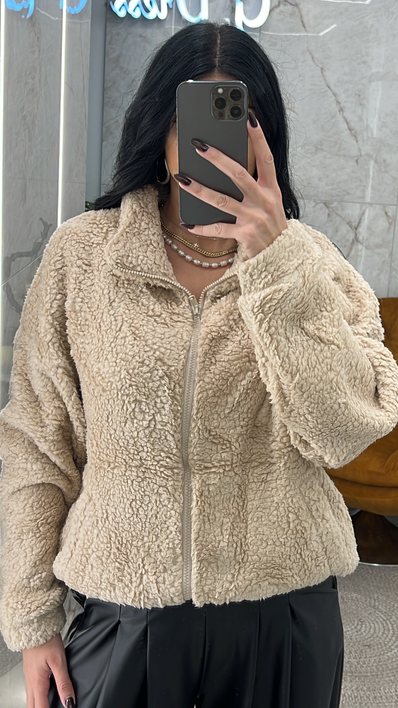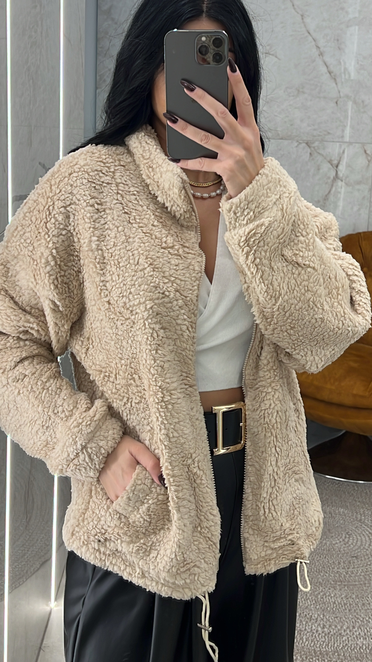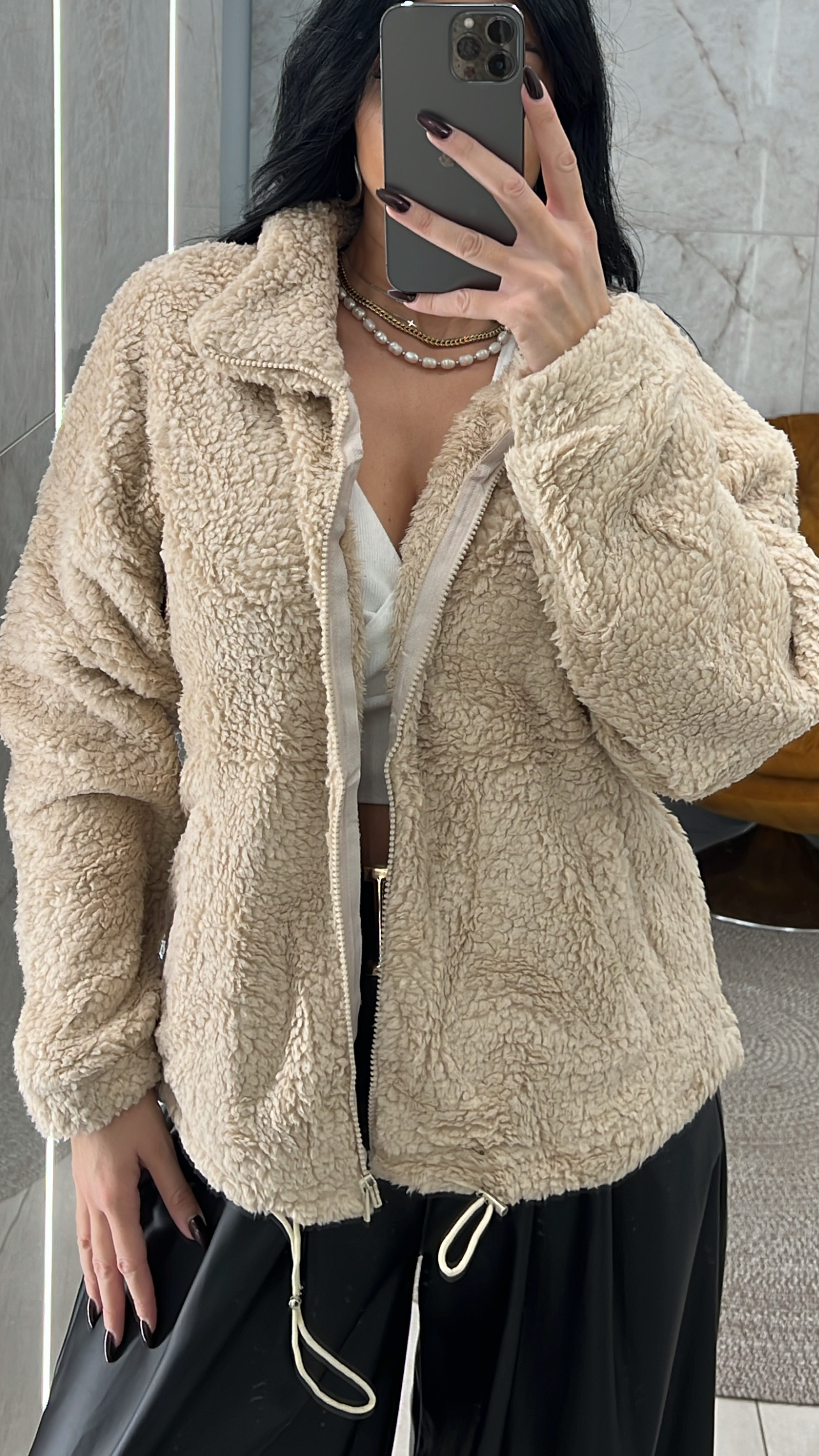 Ζακέτα teddy κλείνει με φερμουάρ έχει τσέπες και στο τελείωμα λάστιχο που μαζεύει