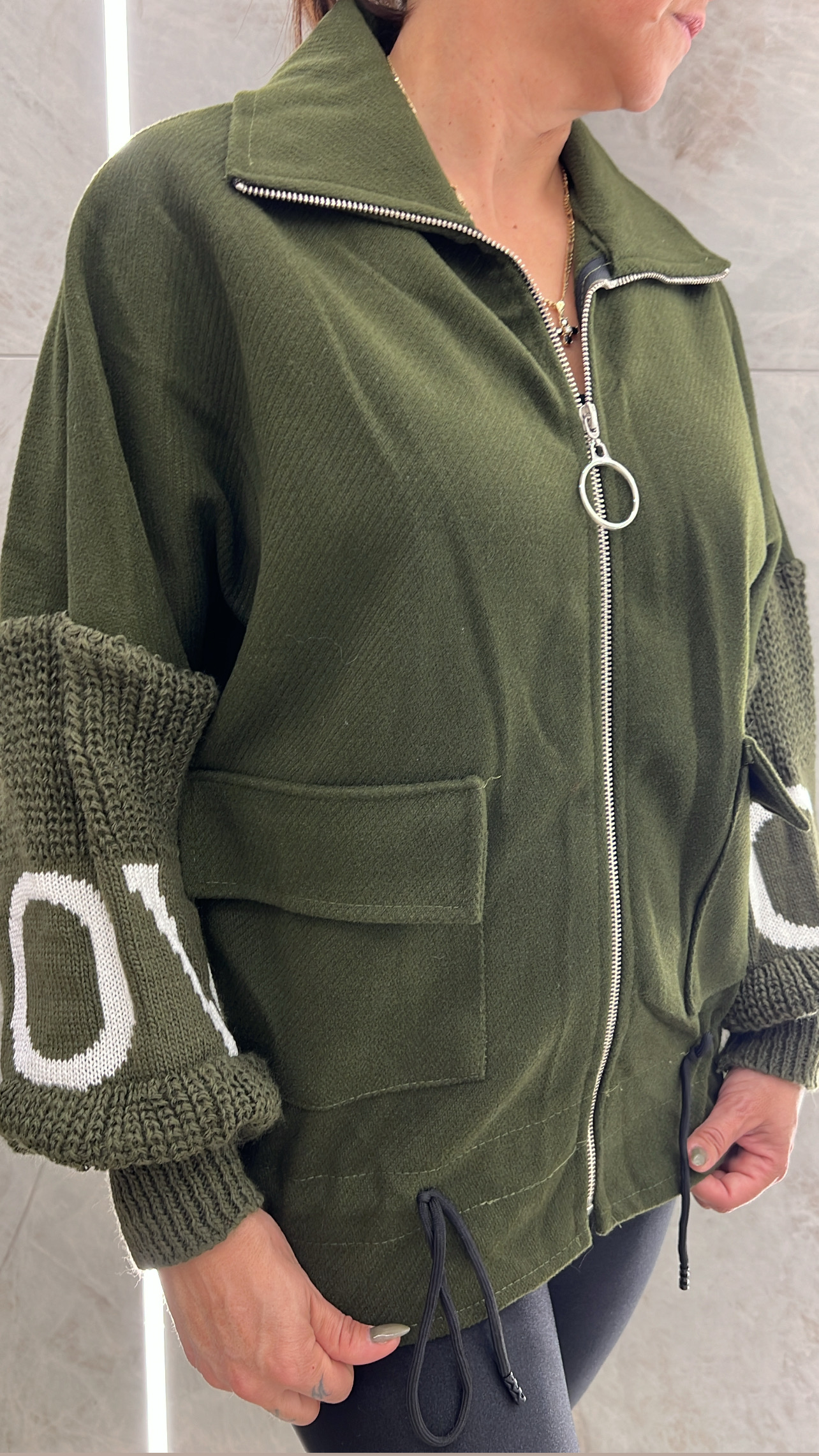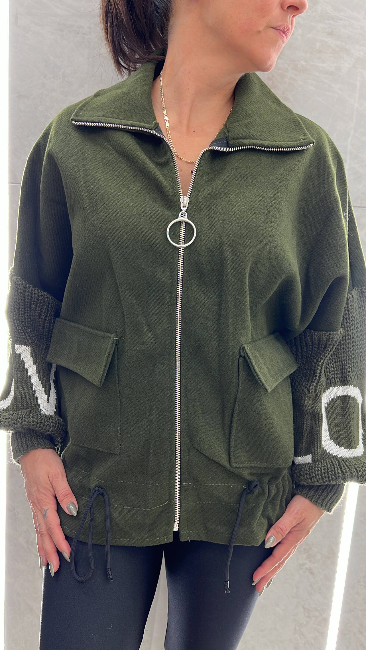 Ζακέτα τσόχα με φερμουάρ και τσέπες έχει κορδόνι στο τελείωμα που μαζεύει και τα μανίκια είναι πλεκτά