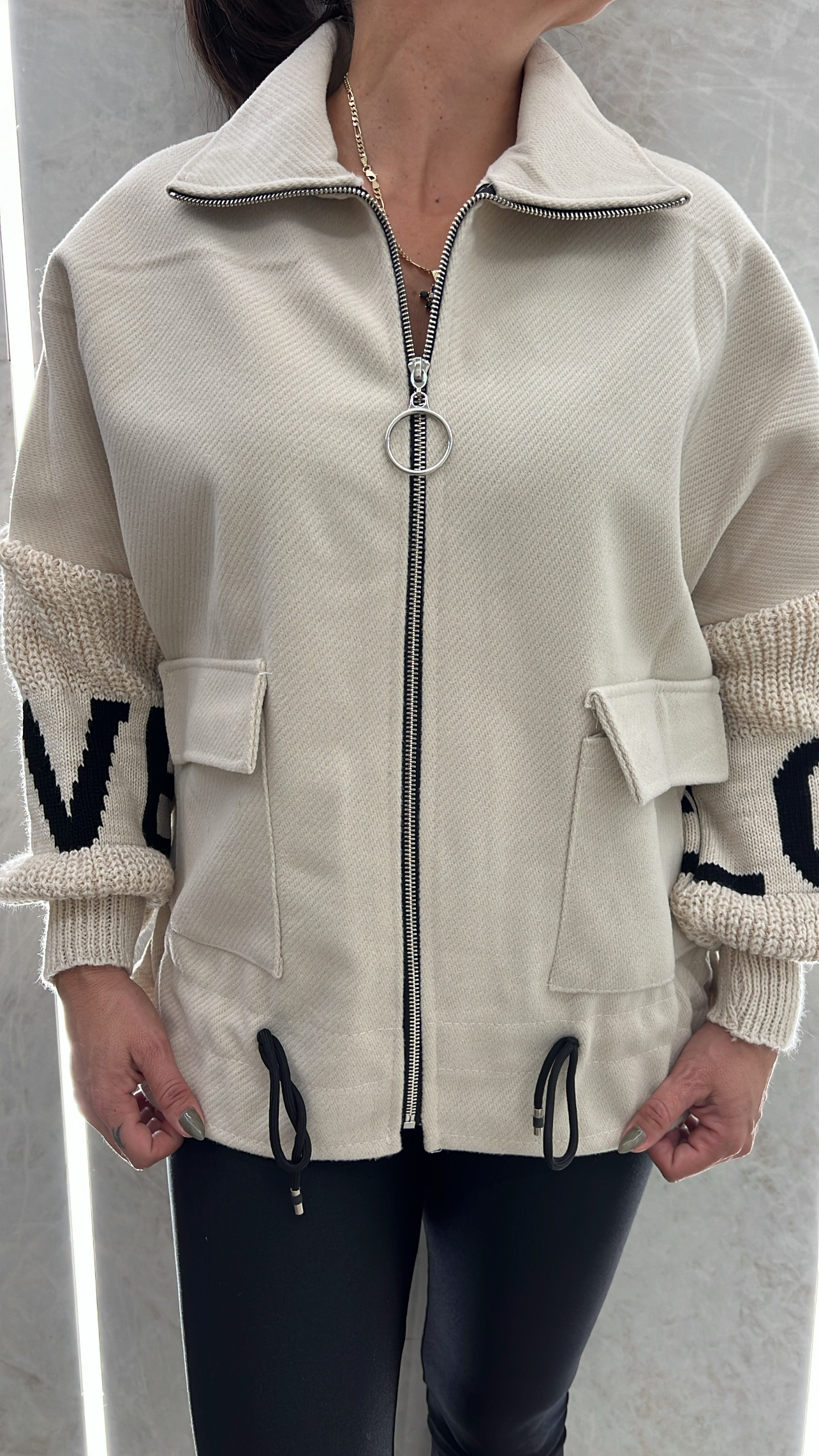Ζακέτα τσόχα με φερμουάρ και τσέπες έχει κορδόνι στο τελείωμα που μαζεύει και τα μανίκια είναι πλεκτά