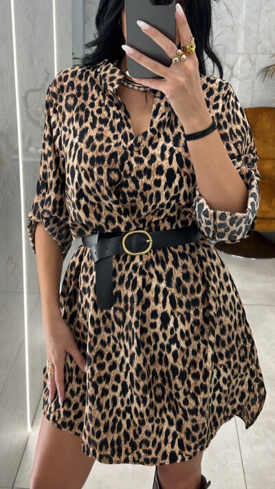 Φόρεμα Mao με Ζώνη/Λεοπάρ