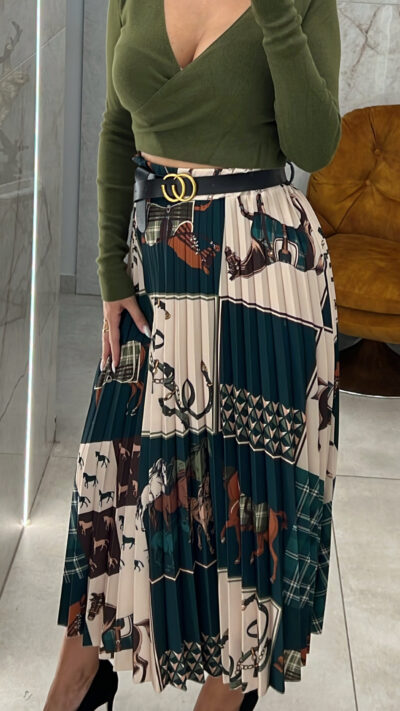 Πλισέ Φούστα με Σχέδιο & Ζώνη/Πράσινο